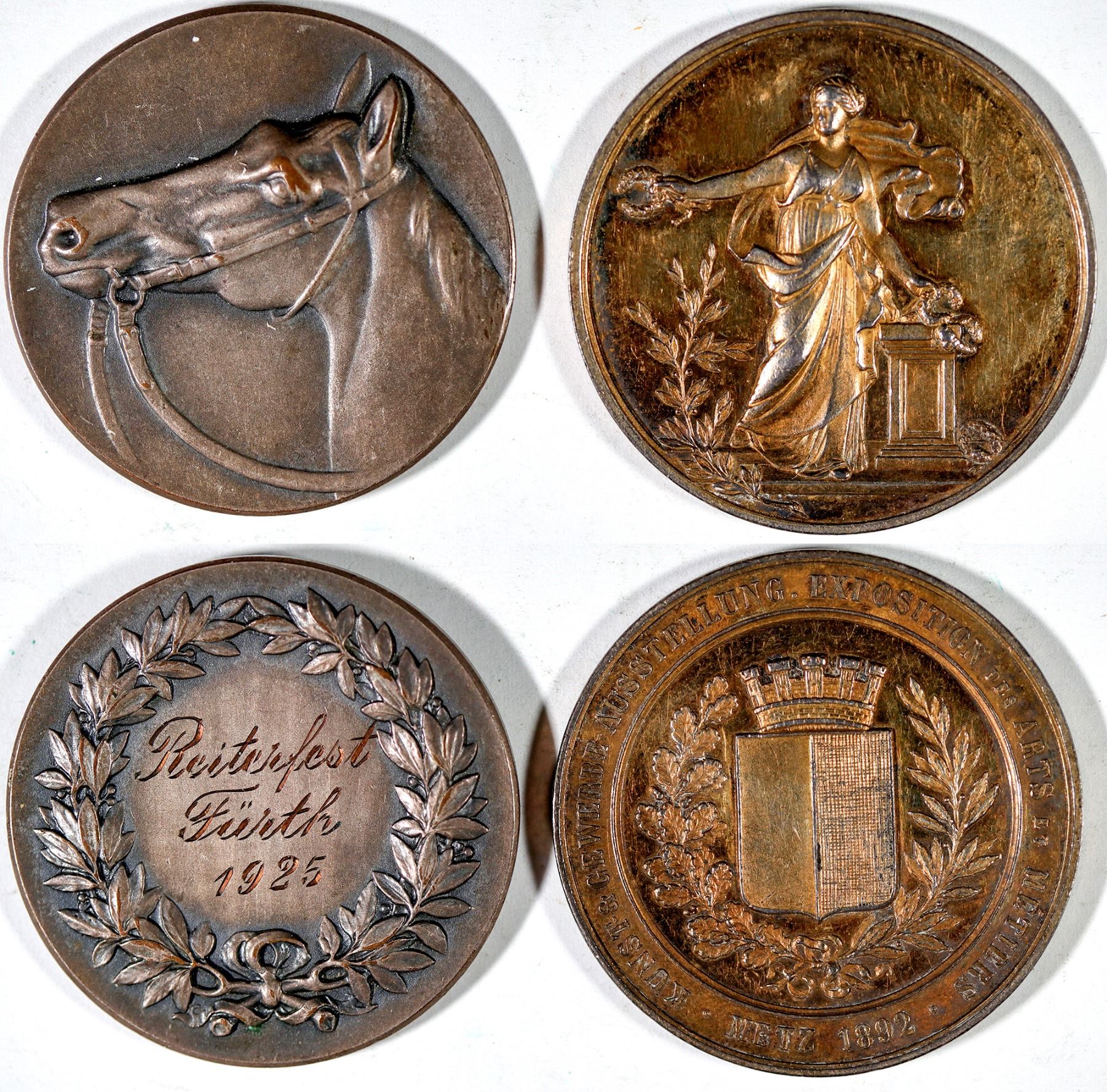 Lot of two: 1) Silver Medal 1892 Arts & Crafts Exhibits at Metz, 41 mm. 2) Reiterfest / Furth / 1925 // horse's head; 40 mm.
