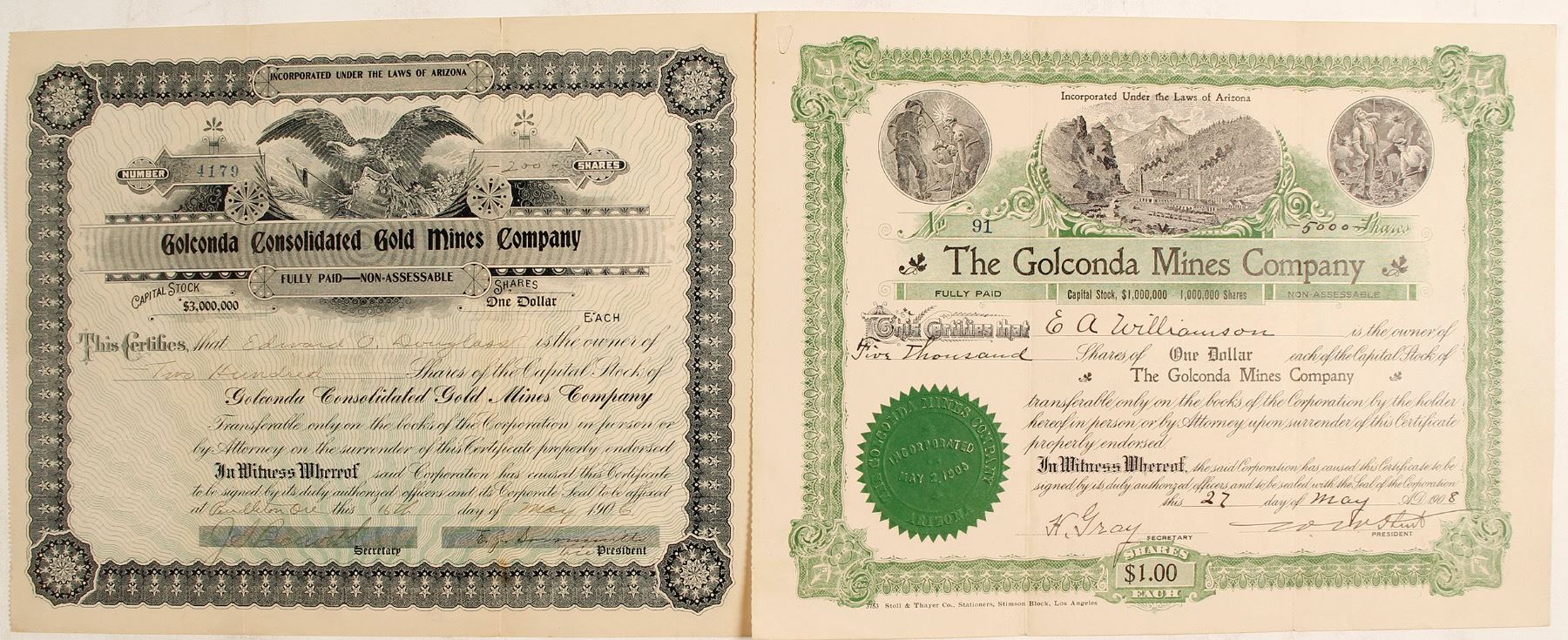 1) Golconda Consolidated Gold Mines Company. Number 4179 for 200 shares to Edward O Douglas in 1906. Issued in Pendleton, Oregon. Not listed in the Copper of Mines Handbook. 2) Golconda Mines Company. Number 91 for 5,000 shares in 1908 to EA Williamson. Signed by WW Hunt and H Gray. Also not listed in Mines or Copper Handbook. Overall these two are in nice condition: two small tears, vertical folds, very light staining at folds. (Laguna Collection) HWAC# 62946 Date: Location: Mohave, Golconda, Arizona