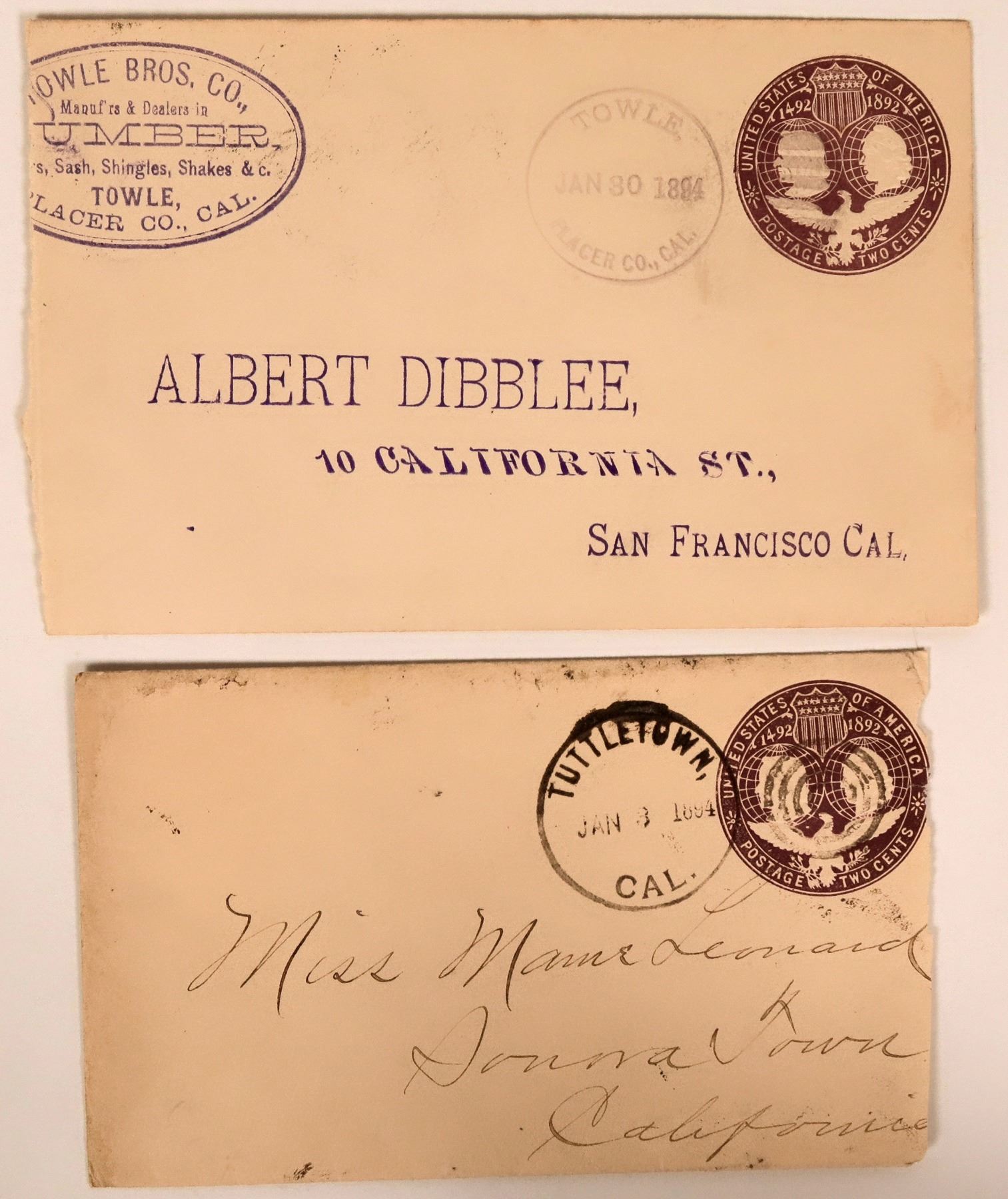 Two covers with Gold Country post marks, including Tuttletown, Tuolumne County and Towle in Placer County. Both are in good condition.