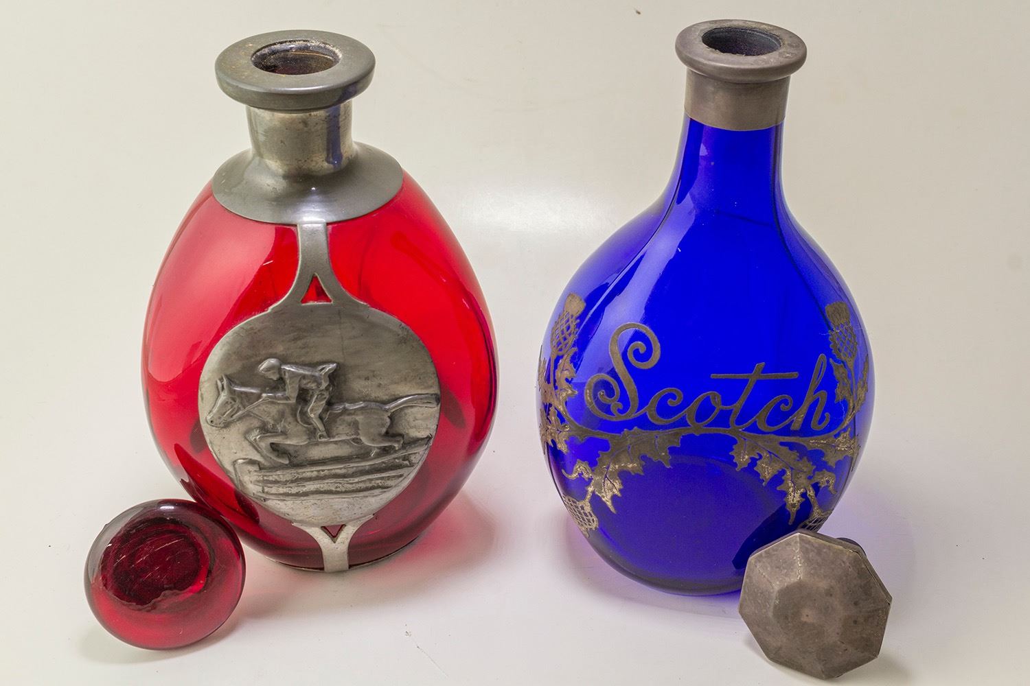 These bottles were specifically made for scotch. One has the word scotch plus floral patterns including a horse racing scene round the collar on what appears to be silver plated pewter. Has a tag on bottom that says" once belonged to State Senator Henderson's Mother" The second is deep ruby red. The former is deep cobalt. Both have original stoppers. This is a scotch lovers paradise pair. Date: Location: HWAC# 46076