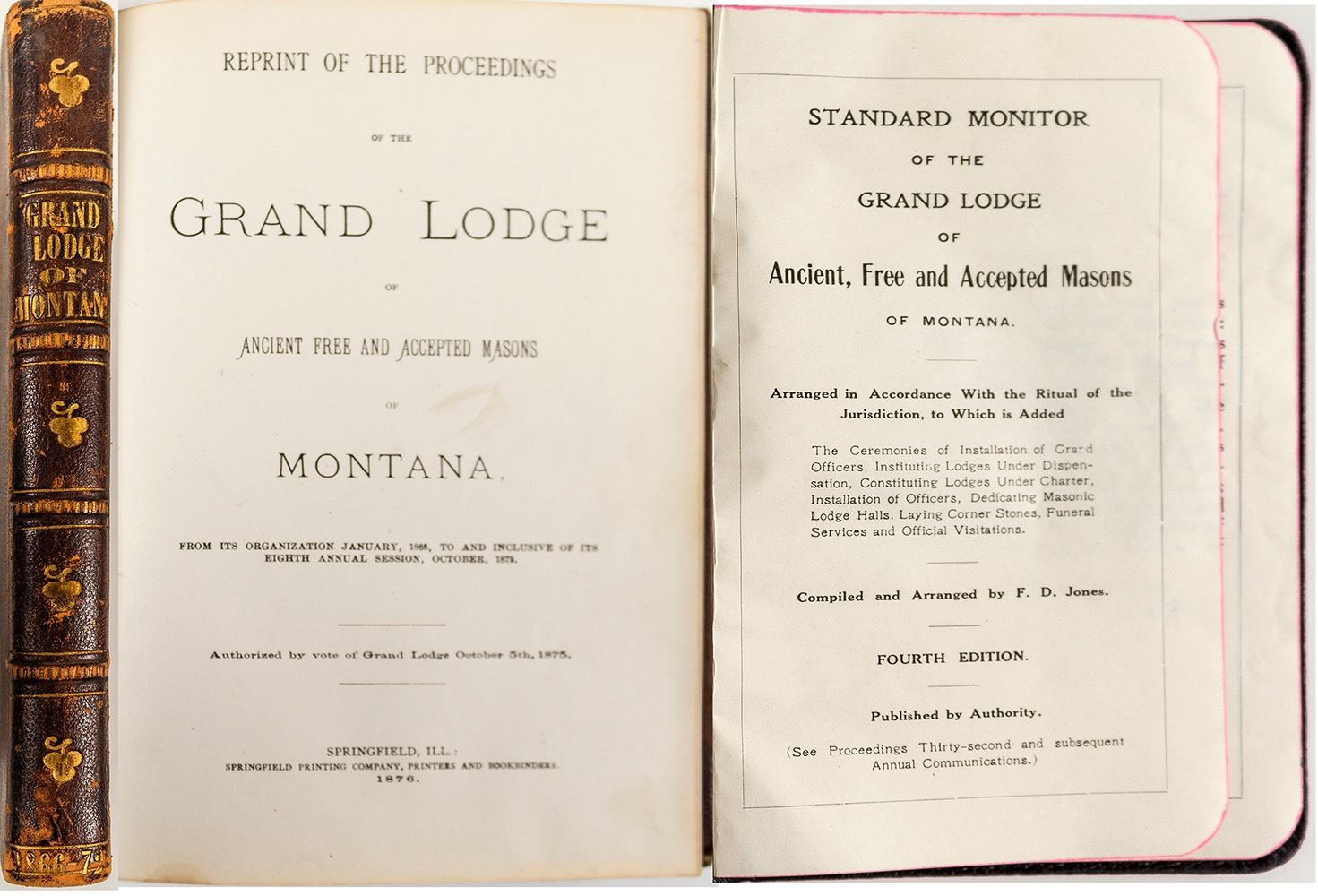 1) Great find. "Proceedings of the Grand Lodge of Montana, A. D. 1866, A. l. 5866." Cloth and leather bound, hardcover, 8.5" x 6", 263 pp. 2) Standard Monitor of the Grand Lodge of Ancient, Free and Accepted Masons of Montana, 1904. Date: Location: Montana HWAC# 40627