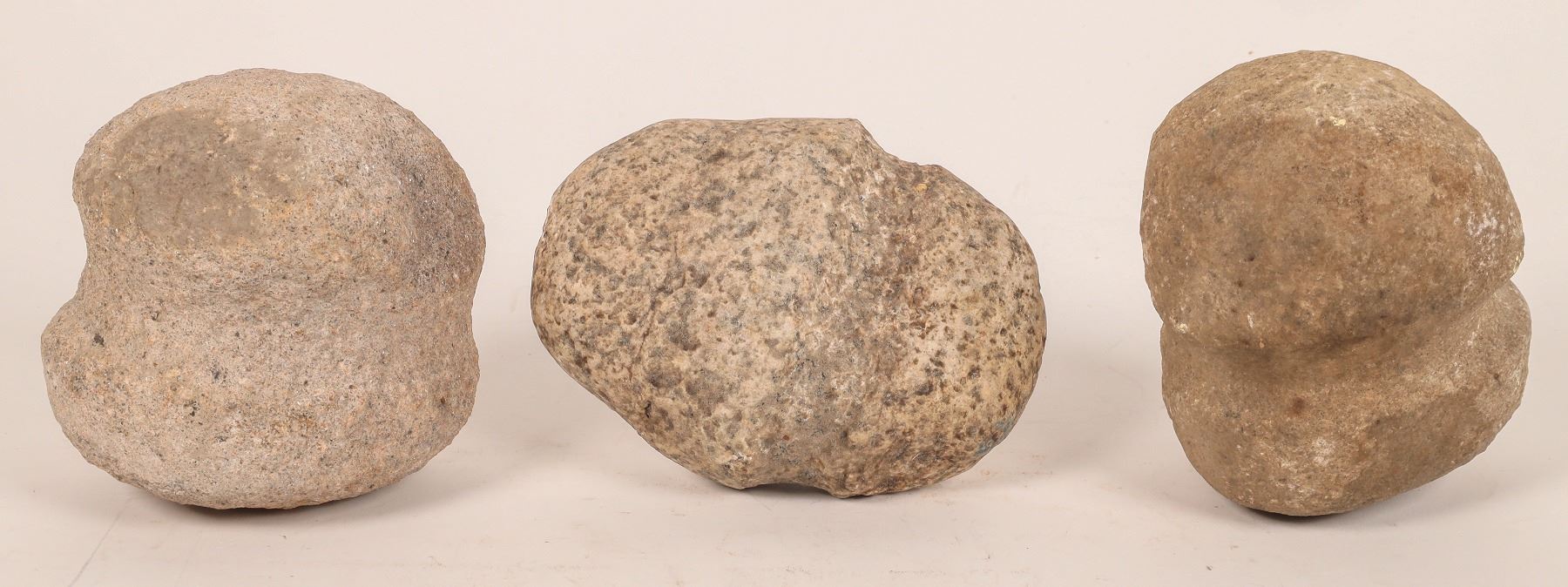 These are three two grooved stone axes, 4.5 in., 5. in, 5.5 in. in length. All are granite, site location is unknown. Early Archaic Period 9,000-8,000 BP.