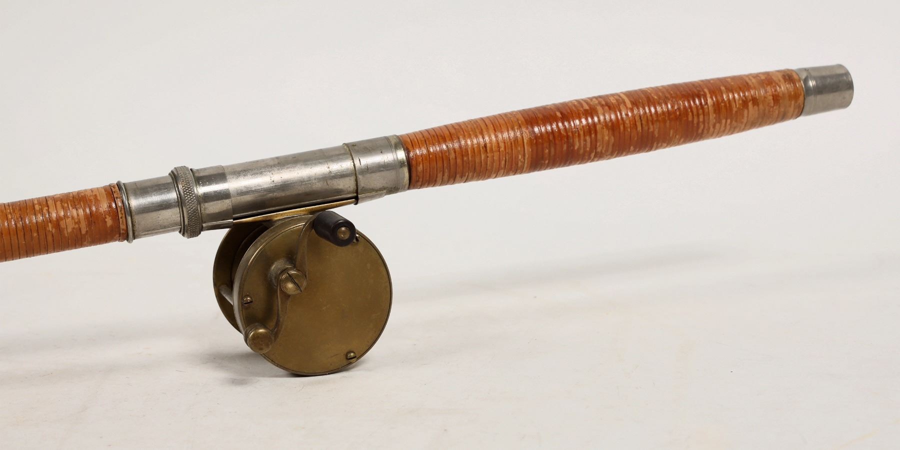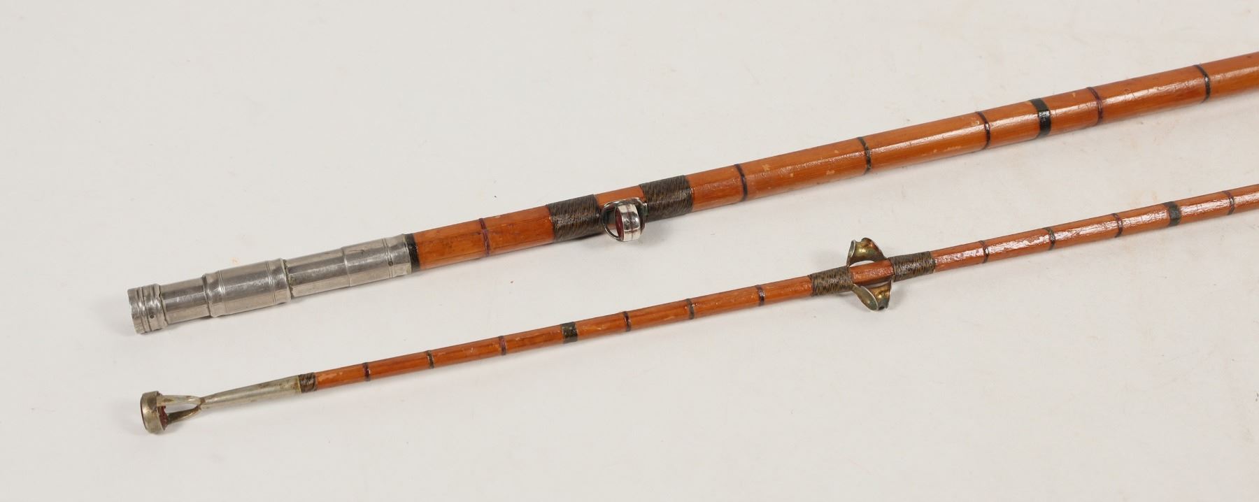 This is a two piece Atlantic Salmon Spey rod made in the 1870's. Assembled at about 8 ft. with a brass reel 2:1 wind ratio in working order. Bamboo construction with ruby eyelets, two eyelets per station on the second section, the no makers mark. Please see photo for details.