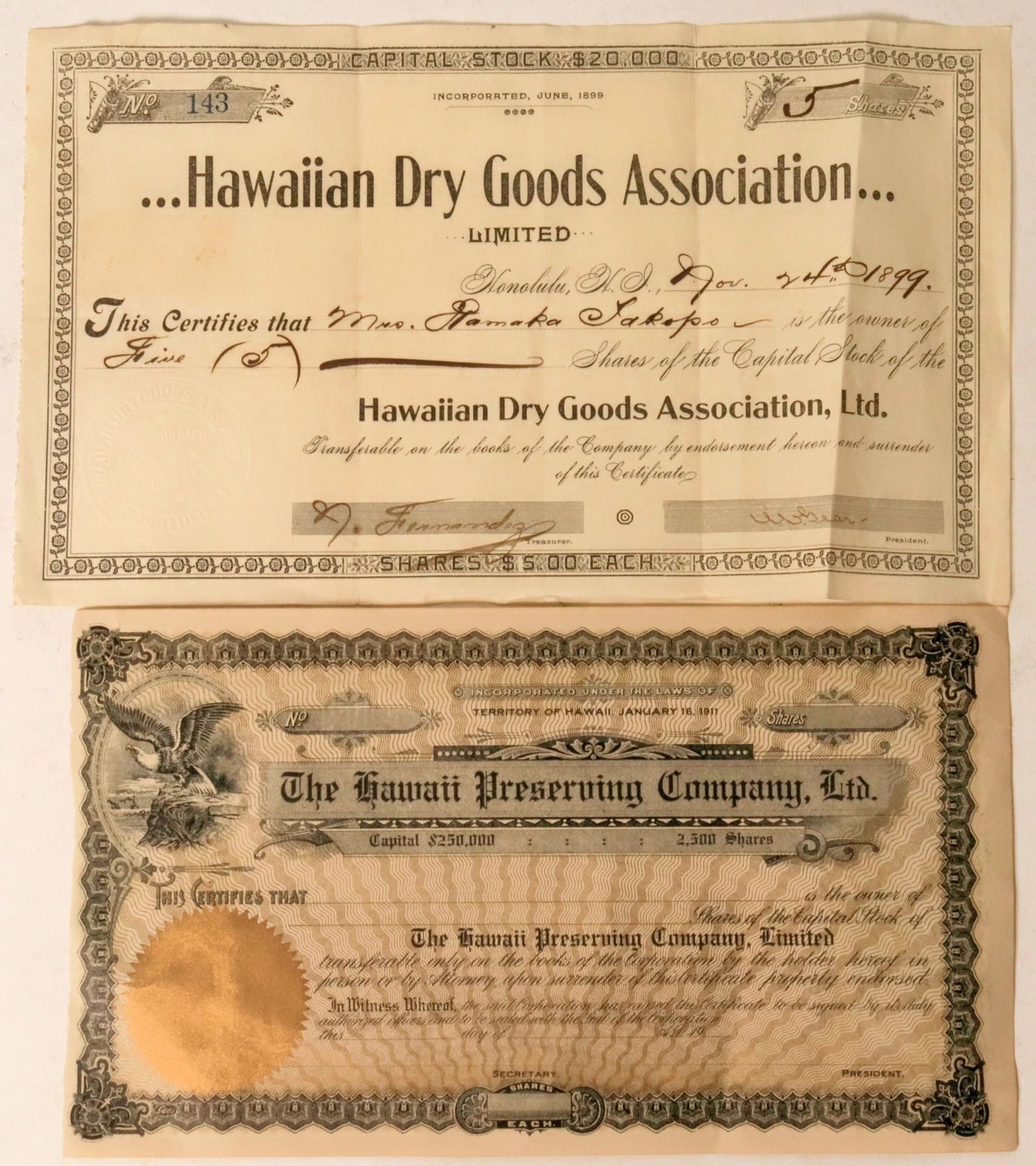 Lot of 2 different. 1) Hawaiian Dry Goods Association. Inc. June 1899. No 143, issued for 5 shares to Mrs. Pamaka Sakopo on Nov. 24, 1899 in Honolulu. Signed by the president (Gear) and treasurer Fernandez. Not cancelled. Folds and creases. 2) The Hawaii Preserving Company Ltd. Inc. 1911. Unissued.