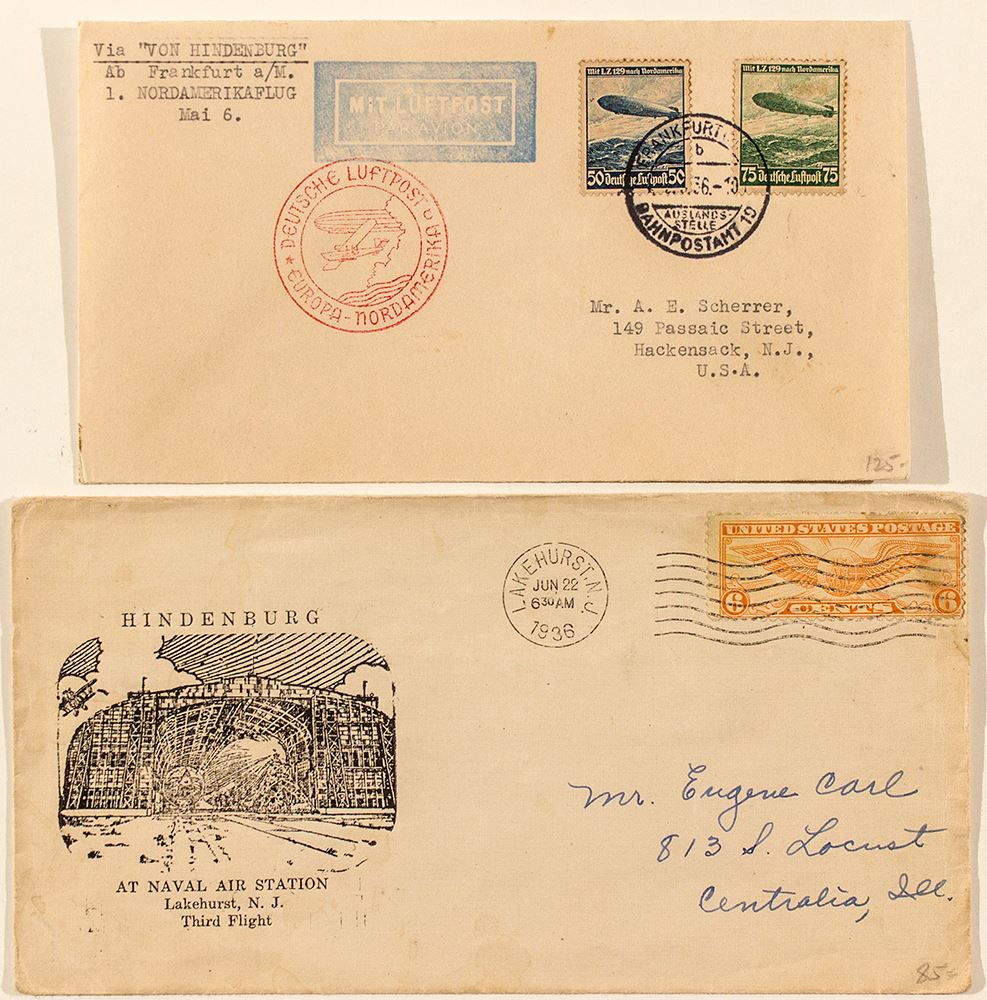 1) Hindenburg at Naval Air Station, Lakehurst N. J. Third flight. June 22, 1938. After the Hindenburg accident. 2) German. "Via 'Von Hindenburg, Ab Frankfurt a/M., 1. Nordamerikaflug." May 1936. This would have been mailed during one of the Hindenburg's 10 trips to the United States and back. (Prag collection)