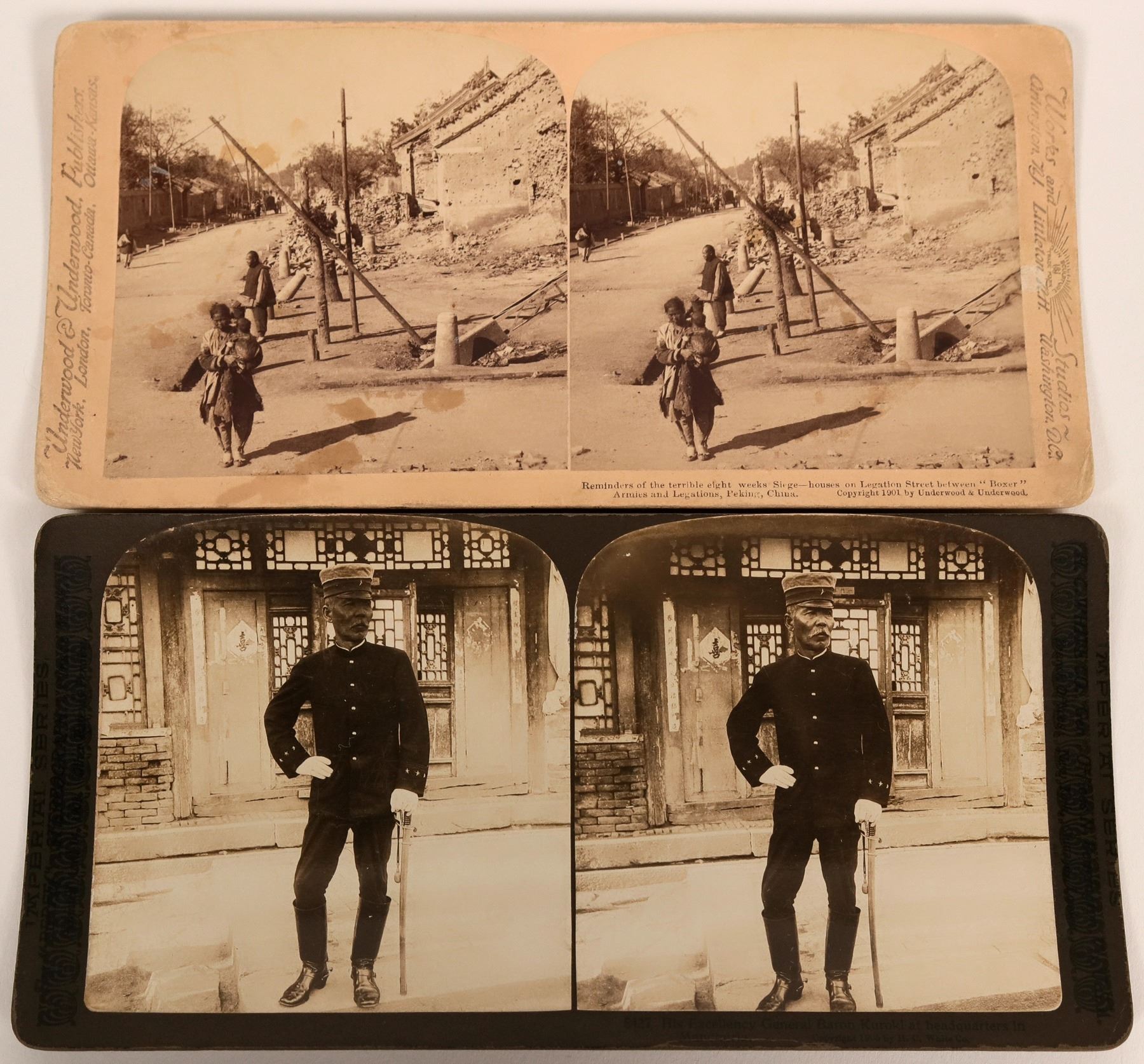 Lot of 2. 1) Imperial Series stereoview of General Baron Kurold at headquaters in Manchuria. Copyright 1905 by HC White Co. 2) Underwood & Underwood stereoview c.1901 of "Reminders of the terrible eight weeks siege--houses on Legation Street between "Boxer" Armies and Legations, Peking, China. Scuffs and some stains. The Boxer Rebellion, Boxer Uprising, or Yihetuan Movement was an anti-imperialist, anti-foreign, and anti-Christian uprising in China between 1899 and 1901, toward the end of the Qing dynasty.