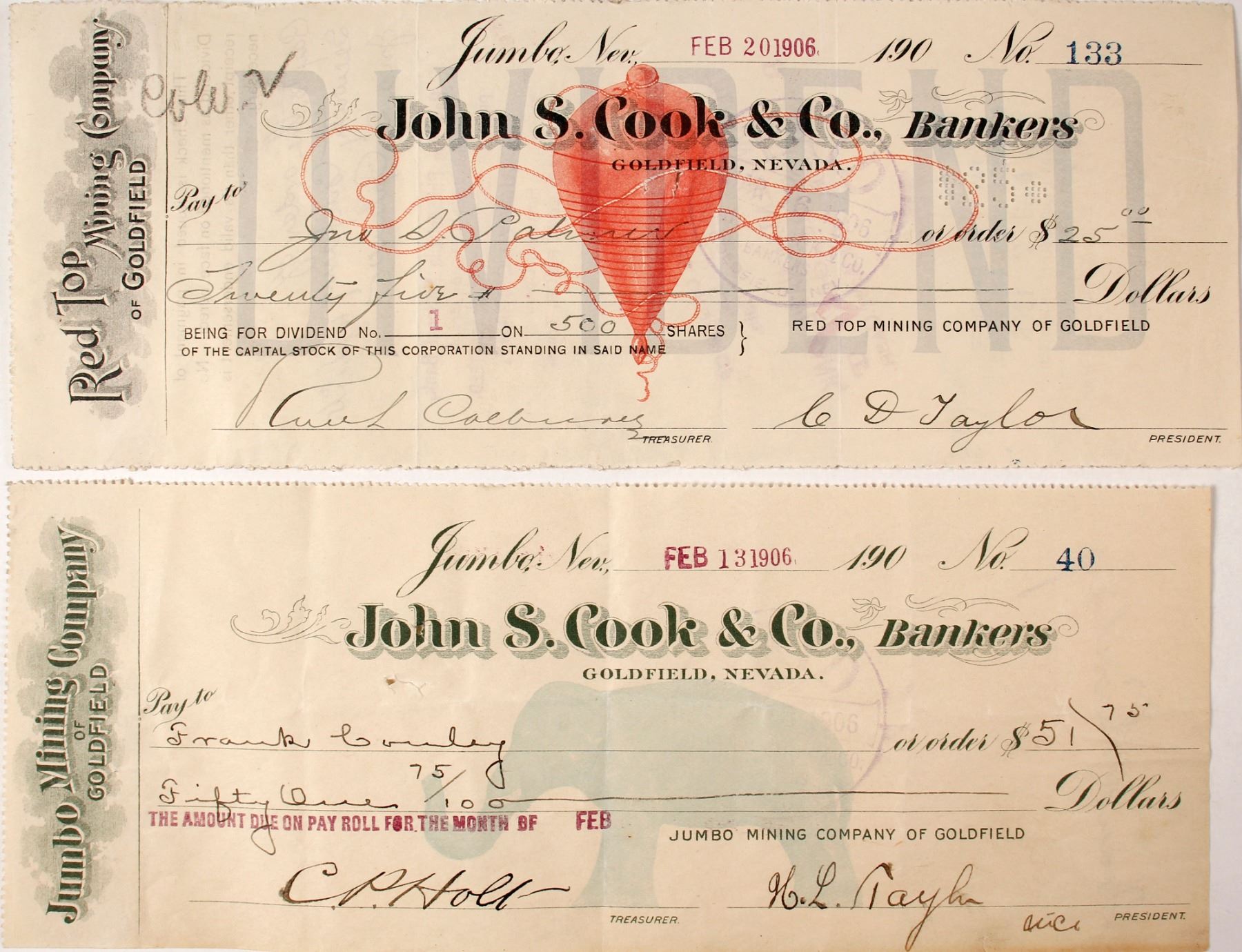 These two John S Cook bank checks are two of the most sought after checks from Nevada. The Red Top mine has a Red Top and the Jumbo mine has a green elephant. The Red Top Mine is check 133 for $25 for dividend #1 on 500 shares. Issued to John S Palmer. The Jumbo Mine is check 40 for February payroll to Frank Crosby for $51.75. Signed by CD and brother HL Taylor. CD was the president of the very successful and profitable Jumbo Mine; HL was the vice president.