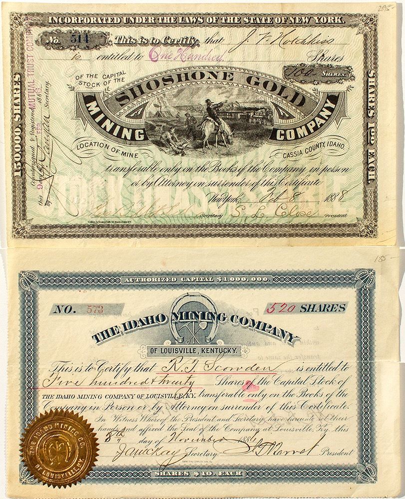 1) Shoshone Gold Mining company # 514 for 100 shares issued to J Hotchkiss. 2) The Idaho Mining Company # 573 for 520 shares issued to R T Scowden. City: State: Idaho Date: 1880's hwac# 22806