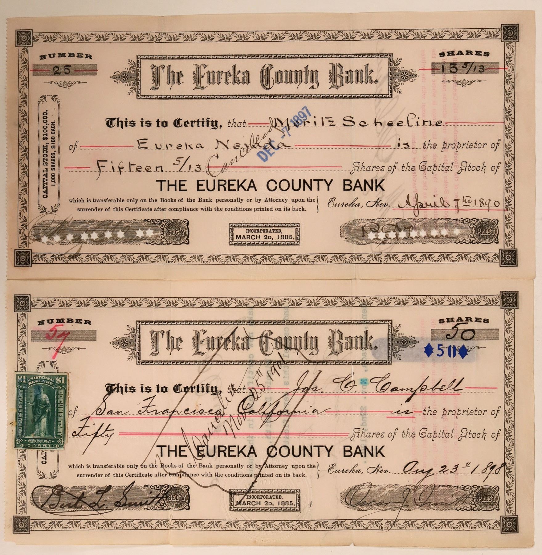 The Eureka County Bank was incorporated on February 23, 1885 by Messrs M. D. Foley, R. K. Morrison, B. Gilman, W. E. Griffin and Mr. Daniel Myer of San Francisco. Its capital stock was one hundred thousand dollars and its first officers and directors were M. D. Foley president, R. K. Morrison vice president, H. T. Hoadley cashier, and W. E. Griffin assistant cashier. Wren in his history of Nevada says, "The bank has done a general banking business and has been the foundation upon which many of the business enterprises of the vicinity have depended." "...which has been the strong fortress of the commercial and financial activity of Eureka county and by its honorable business methods and sound conduct has won the confidence of the business element of the county and the state has had a successful existence for nearly twenty years and has throughout this period been under the control of men of highest financial integrity and reliability."The Eureka County Bank opened a branch in Elko around 1903. In 1905 the First National Bank of Elko took over the Elko operations.