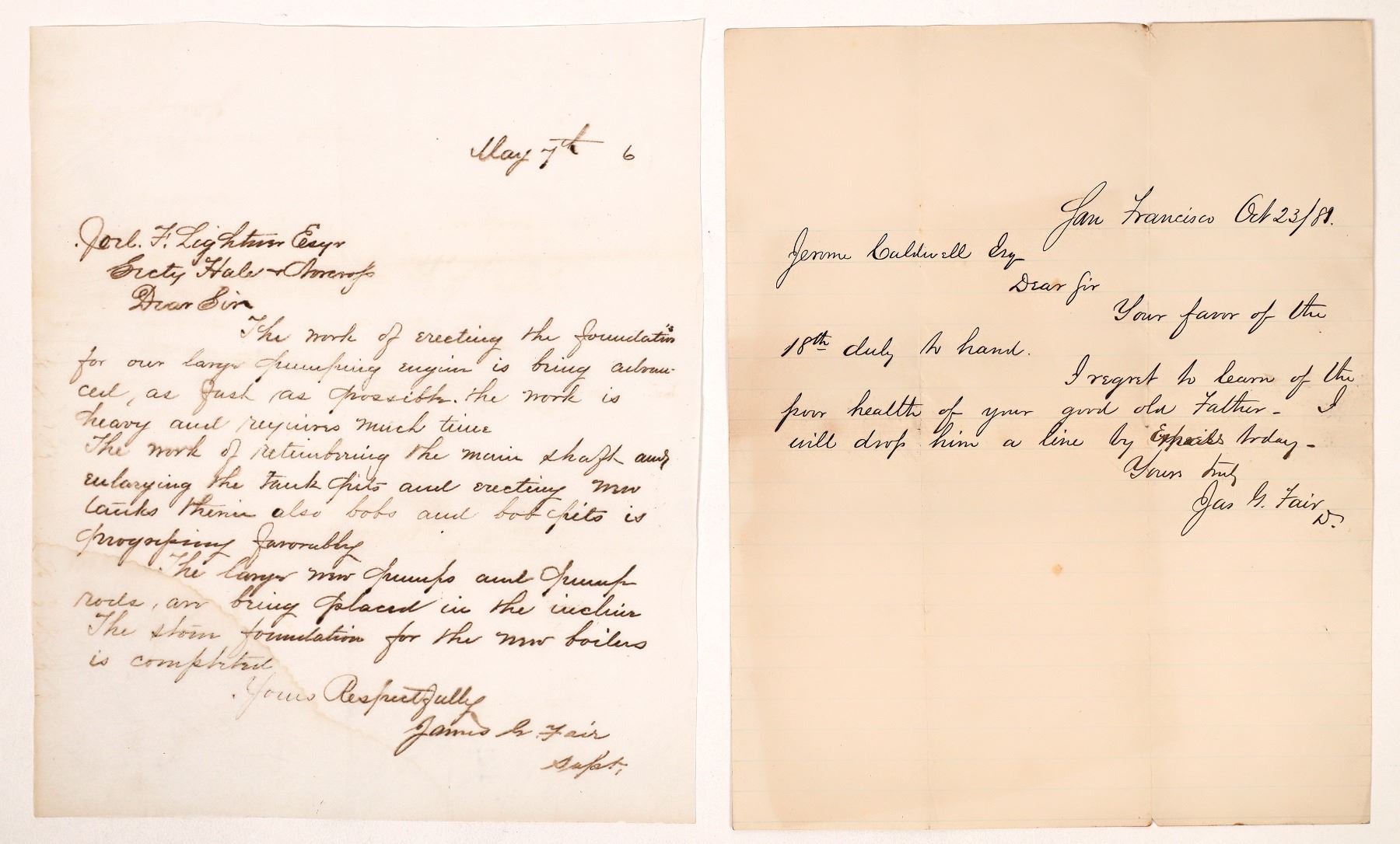 Lot of 2 for Bonanza King mining millionaire and US Senator James G. Fair. 1) Letterbook copy of letter sent by Fair in the 1860s when he was superintendent of the Hale & Norcross. Sent to the secretary, the message talks about erecting the foundation for a large pumping engine, retimbering the main shaft, and erecting new tanks. The Bonanza Kings wrestled away this mine from the Bank of California in 1869 by buying up the stock. It is likely this letter dates to just after their takeover when Fair became supt. and they made improvements to make it a paying mine. 2) Letter written by a secretary for Fair, San Francisco, 1881. Addressed to Caldwell and discusses personal health. Virginia City Nevada Franklin Collection