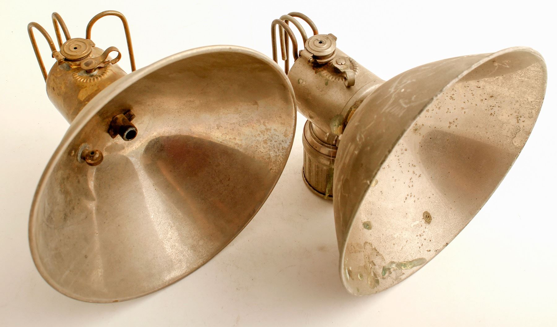 Early Justrite style brass lamp pair with hand holder. Large 6 inch reflector. Marked Justrite with a 1915 patent date. One lamp in brass and the other in nickel. Both have large reflectors. State: City: HWAC#: 46462 Date: