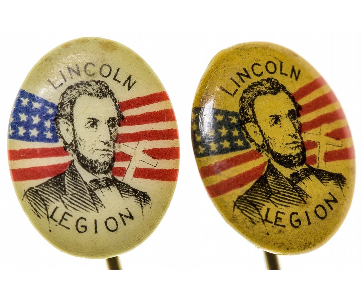 Identical oval celluloid stick pins. Feature vignette of Lincoln with American flag and the text "Lincoln Legion." Approx. 3/4" x 1/2" on 2" pin. The Lincoln-Lee Legion was an anti-drinking organization formed in 1903 by Howard Hyde Russell. He specifically targeted children, trying to get them to pledge abstinence from alcohol for life. "Lee" was added to the name to appeal to Southern parents and children. Both pins show toning/soiling, one more than the other.