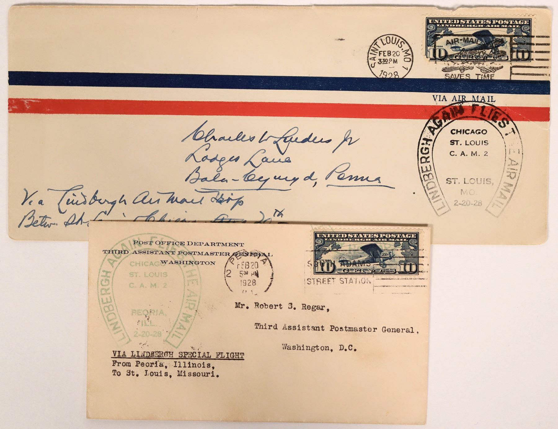 1) Letter size "Lindbergh Again Flies the Air Mail" horseshoe green stamp. Ten cent Lindbergh stamp. Flight from Peoria to St. Louis. 2) Legal size. Same horseshoe stamp, but black. Same Lindbergh air mail US Postage stamp. This was for Chicago to St. Louis. These two covers escaped from the Reynolds postal history collection April 2020.