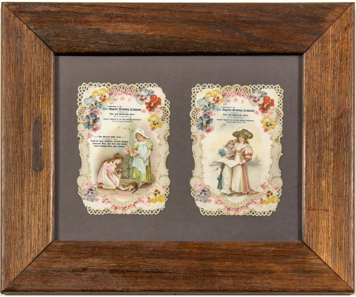 "Compliments of the Los Angeles Brewing Company/ Producers of Pure and Wholesome Beers Exclusively/ Families supplied by our Own Bottling Department." They advertise "Our Mission Malt Tonic/ A palatable liquid/ Food for puny Children, nervous Women, worn-out Men, and those who would avoid running down their system." First die cut shows two girls feeding a cat from a saucer. The second die cut features two girls reading from a large book. Bright colors. Floral borders. Each die cut measures approx. 5" x 7 1/2" in a frame that is 19 1/2" x 16." Burt Collection