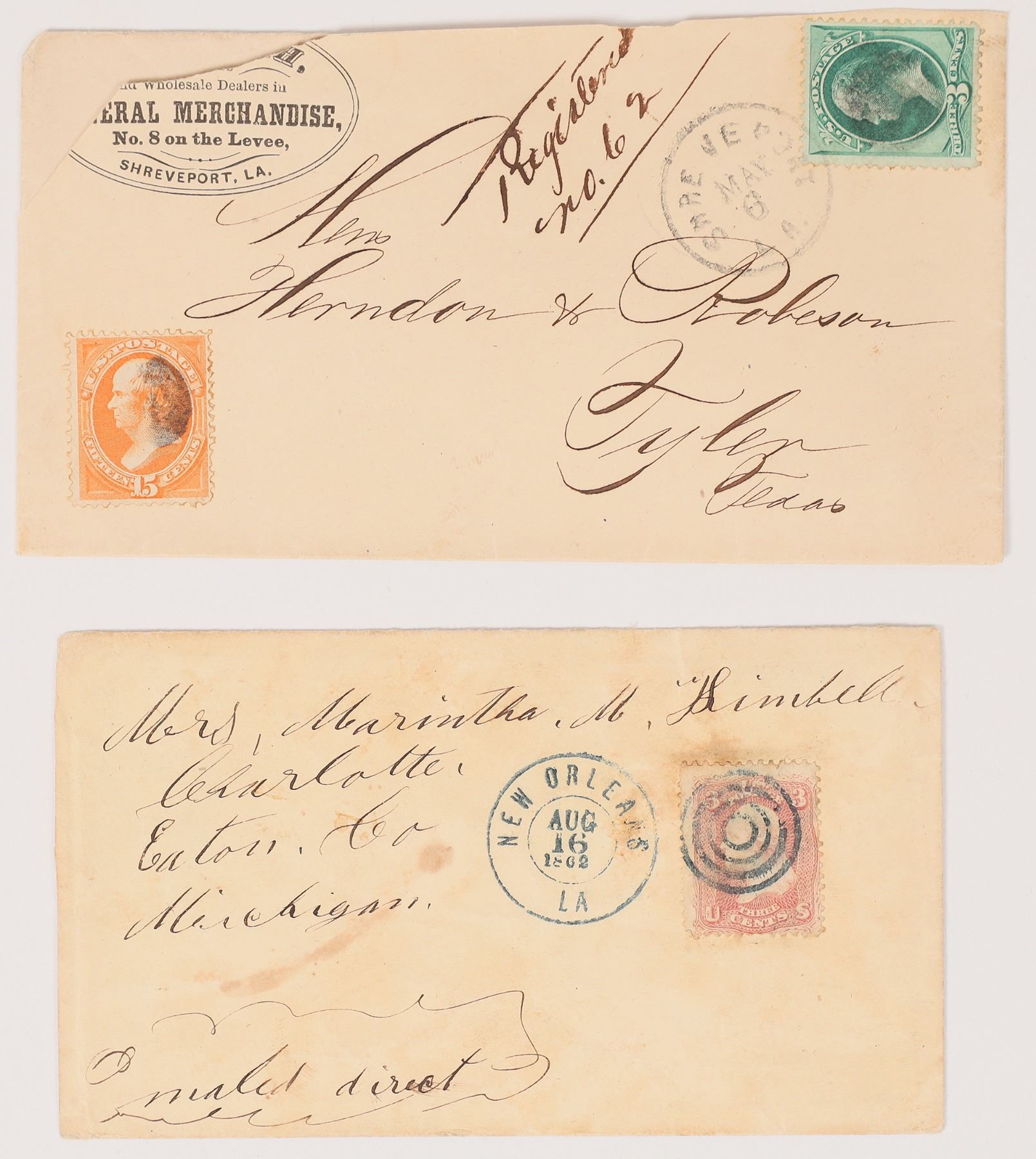 1) Shreveport advertising cover on General Merchandise. Three cent green stamp. Added is an A51 Franklin orange 15c stamp. Manuscript Registered No. 62 (the reason for the 15c stamp). Top right is torn making identification of cc impossible. 2) Civil War cover from New Orleans to Michigan. New Orleans double circle postmark with a date of Aug. 16, 1862. Manuscript 'Mailed Direct'. Two interesting Louisiana covers/stamps!