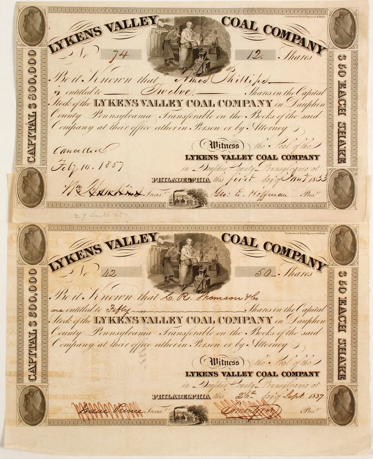 Two Lykens Valley Stock Certificates. One cancelled the other not. Lykens was located at Bear Gap between Coal (or Thick) Mountain and Big Lick Mountain. Dauphin County. The tunnel of the Lykens Valley Coal Company, which went approximately 3300 feet into Coal Mountain. This effort was made in order to reach the last vein of coal. At the end of the tunnel, an air hole was made to the surface. This air hole became somewhat legendary in that miners and school children from Gratz and Lykens Township used it to access the Bear Gap Tunnel and get to the Lykens side of the mountain. [Lykens Valley website] 1) 1837! Number 42 for 50 shares to CR Thomson & Co. Signed by Isaac Prince and president Simon Gratz (as in Gratz borough of which Simon was the founder!). Dateline 1837. Blacksmith shop vignette. 2) Same as number one. 1853. # 74 for 12 shares to Amos Phillips. Signed by WIlliam Hankins and president George E Hoffman. Cancelled 1857 written in pen. Ken Prag Collection