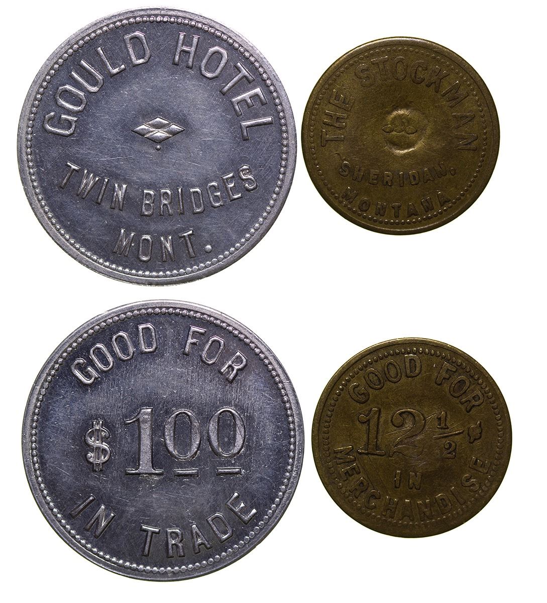 Two Tokens from Madison County that include Sheridan and Twin Bridges. R-4 Gould Hotel / Twin Bridges / Mont. // GF / $1.00 / IT. Round, Aluminum, 35mm. R-4 The Stockman / Sheridan, / Montana // GF / 12 1/2c / In Merchandise. Round, Brass, 25mm. Damage on front, something stamped it. Date: Location: Madison County, Montana HWAC# 40844