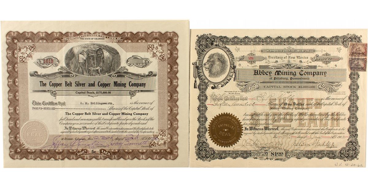 Certificates from two different companies operating near Magdalena. 1) Abbey Mining Company of Pittsburg, Pennsylvania, cert. #28, issued in 1902 to E.R. Kopp. Signed by Nelson Weddle Jr. as president and J.F. Hinckley as secretary. Owned the Abbey group, 22 mi. north of Magdalena. Copper and silver. Fold split top right fold. 2)The Copper Belt Silver and Copper Mining Company, cert. #1613 issued in 1922 to C.M. Hollingsworth for 1200 shares at Denver, CO. The company operated at Magdalena, Socorro County, N.M. Both are uncancelled.