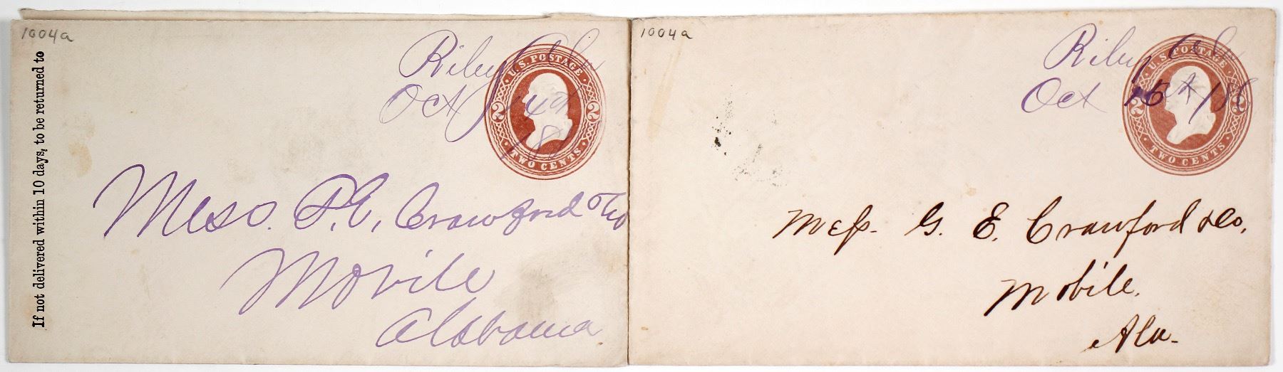 Lot of two envelopes with hand-written cancels over the postage from Riley, Alabama, dated October 14, 1886, and October 15, 1886. Date: 1886 Location: Riley, Alabama HWAC# 64407