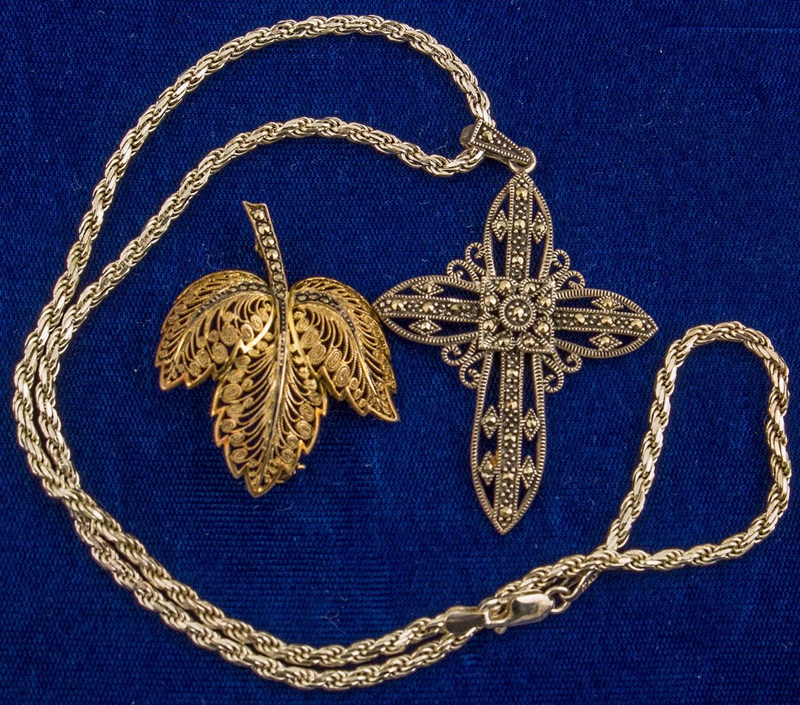 Marcasite cross and silver chain (925). Also, Vintage Alice Caviness Germany Gilt Sterling Silver Filigree Marcasite Leaf Pin. Beautiful fine detail work on this lovely filigree leaf form brooch, 1.75". The leaf is gold washed sterling silver with marcasite accents. Caviness jewelry is very distinctive and beautiful, which explains why it remains so popular today. State: City: Date: ID#45601