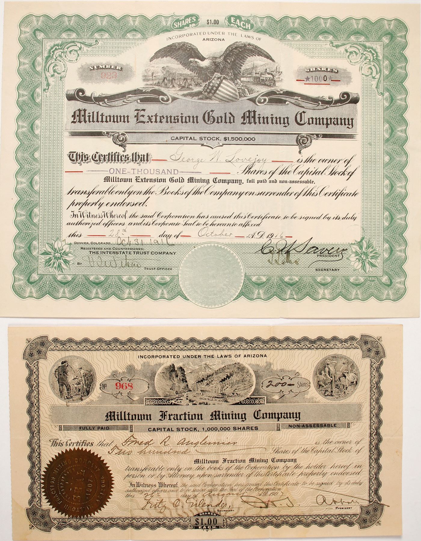 Milltown was the dream of Taylor and Kendrick. They would lay out the townsite in November of 1903. This would make Milltown and incredibly early suburb of Goldfield. Columbia and Jumbo would be two others. Milltown was just southwest of the rich Florence Hill. The Reno Evening Gazette reported in October 4, 1904 that the town of Goldfield and its suburbs of Milltown, Jumbo and Columbia had all the workers it could manage. The article pointed out the anyone else arriving would have trouble finding work and the high prices in Goldfield would soon absorb the small savings of an average laborer. “People without money stay away!” In 1906 Milltown was not only a small, but thriving suburb; it was an important railroad stop for both the Tonopah & Goldfield Railroad, but also the Bullfrog Railroad. It was not only a milling site for Goldfield gold, but in the middle of some rich mines. [collateralhistory.com] 1) MIlltown Extension Gold MIning Company. 1916. Number 923 for 1000 shares to George W Lovejoy. Signed by C Savery and Wickes(?). 2) Milltown Fraction Mining Company. 1907. Number 968 for 200 shares to Fred R Anglemier(?). Signed by Fritz Eilender and Abbott. The Fraction has discoloration and the Extension has pinholes. Otherwise nice examples. (Bennett Collection)