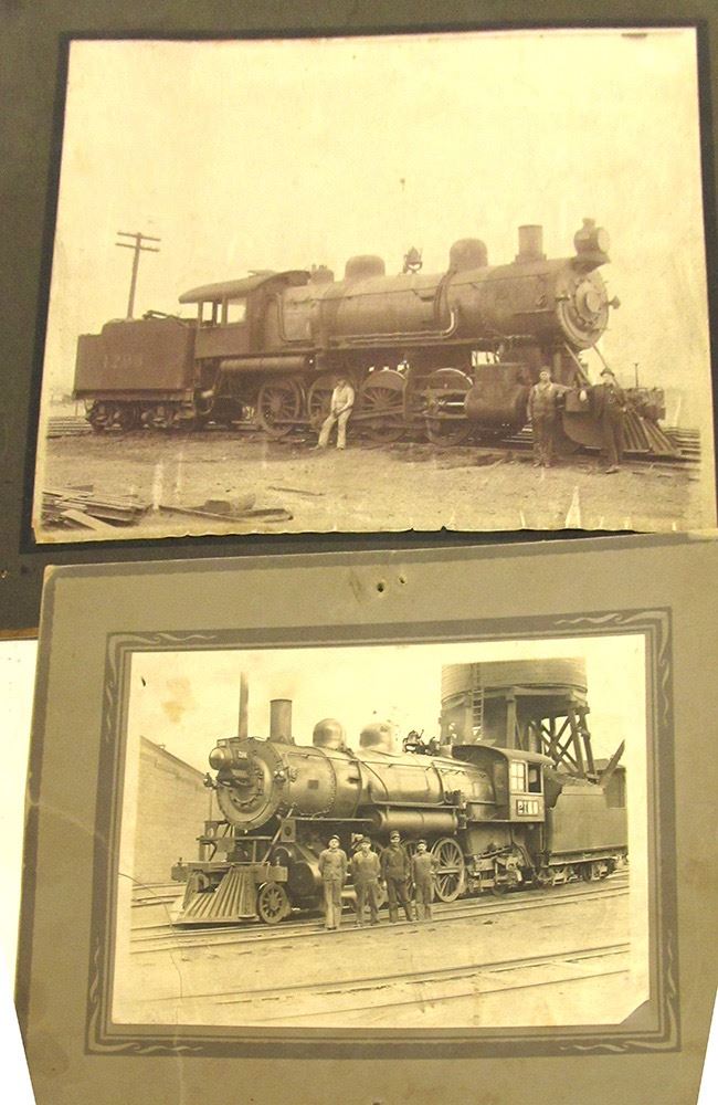 1 photo of train engine with 4 engineers(?) standing in front of train. There is very faint writing on back reading "Butte 1909, T.V.(?) Sullivan, & 2 more signatures. 2 holes at top, appears to have been hung up at one time. 7.5 " x 5.5"; 2) Photo of Engine #1293 with 3 men standing in front, very faint writing on back reading "Bridger, MT 1910. Staining on back from moisture but does not effect photo on front. 10" x 8". Date: early 1900's Location: HWAC# 56751