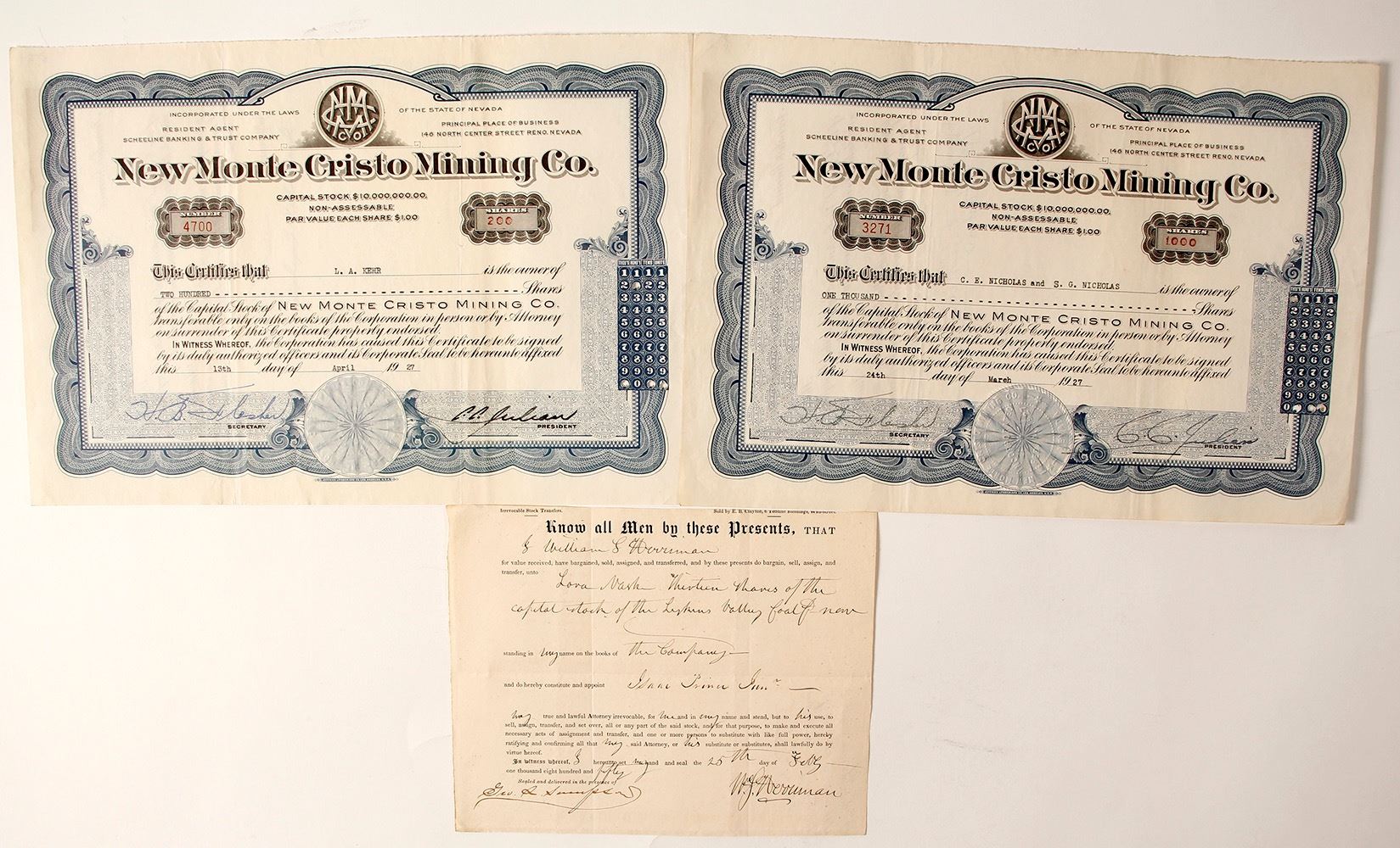 Two 1927 issued stocks for the New Monte Cristo Mining Company, a Death Valley mining scam by C.C. Julian. Julian signed both as president. Two different styles of his signature. Not cancelled. Showman and schemer CC Julian was known for his oil stock schemes in the 20s known as the "Great Los Angeles Swindle." He then ripped off a set of investors with a silver-bearing lead mine in Death Valley. In 1929, Julian left mining and returned to oil schemes, taking his own life 5 years later. The New Monte Cristo Mining Company was a consolidation of multiple mines including the Monte Cristo in Arizona. (This company was not affiliated with the famous Monte Cristo Mine in the Angeles National Forest just north of Los Angeles). (Prag Collection) Date: Location: Arizona HWAC# 55431