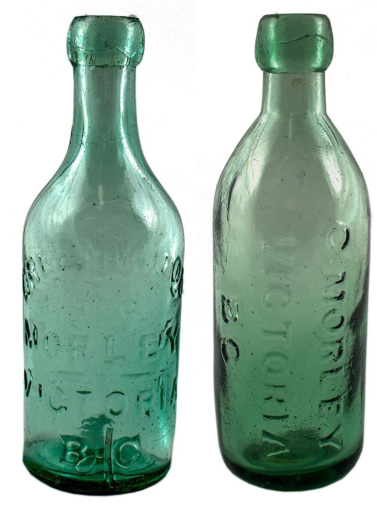 Two Morley applied top sodas from Victoria, British Columbia. Greenwood and Morley, Victoria, BC. Tall aqua soda, larger than the classic Pacific Glassworks manufactured soda. Bubbles clean and vibrant. Appears to have been professionally cleaned. No visible damage. The second bottle is C. Morley, Victoria, BC. Light lime green, embossing vertically. Professionally cleaned. Neither of these bottles appear to be produced by a western US glass manufacturer. They are distinctly different than the other blob sodas produced in the west. City: Victoria State: zBritish Columbia Inventory Number: 39666