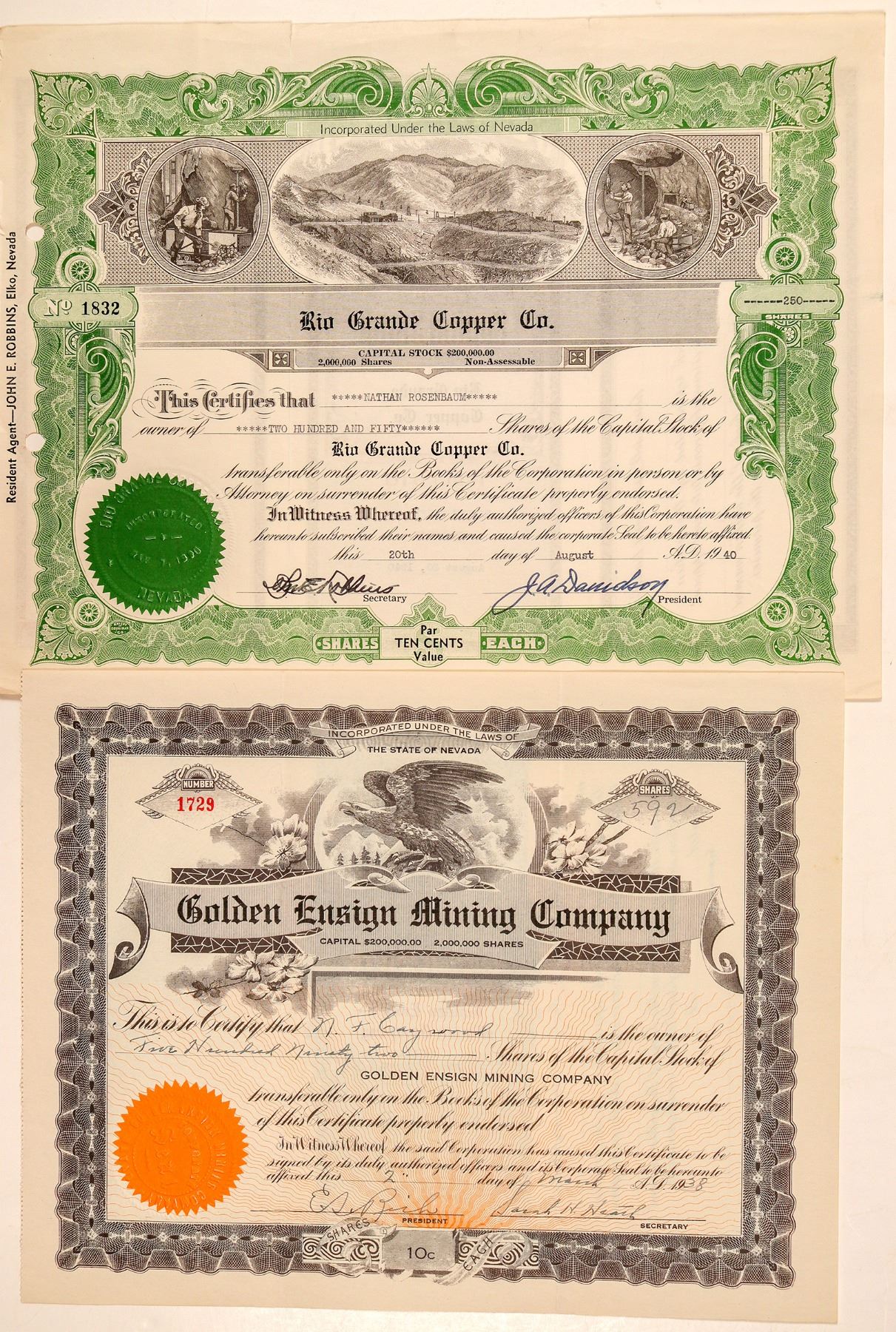 Lot of 2 different Mountain City in Elko County. 1) Golden Ensign Mining Company. Issued for 592 shares in 1938. Not cancelled. Black border, orange seal, floral logo, eagle vignette. Folds, nice. 2) Rio Grande Copper Company. Issued in 1940 for 250 shares. Punch cancelled. Three mining vignettes. Folds. Ken Prag Collection