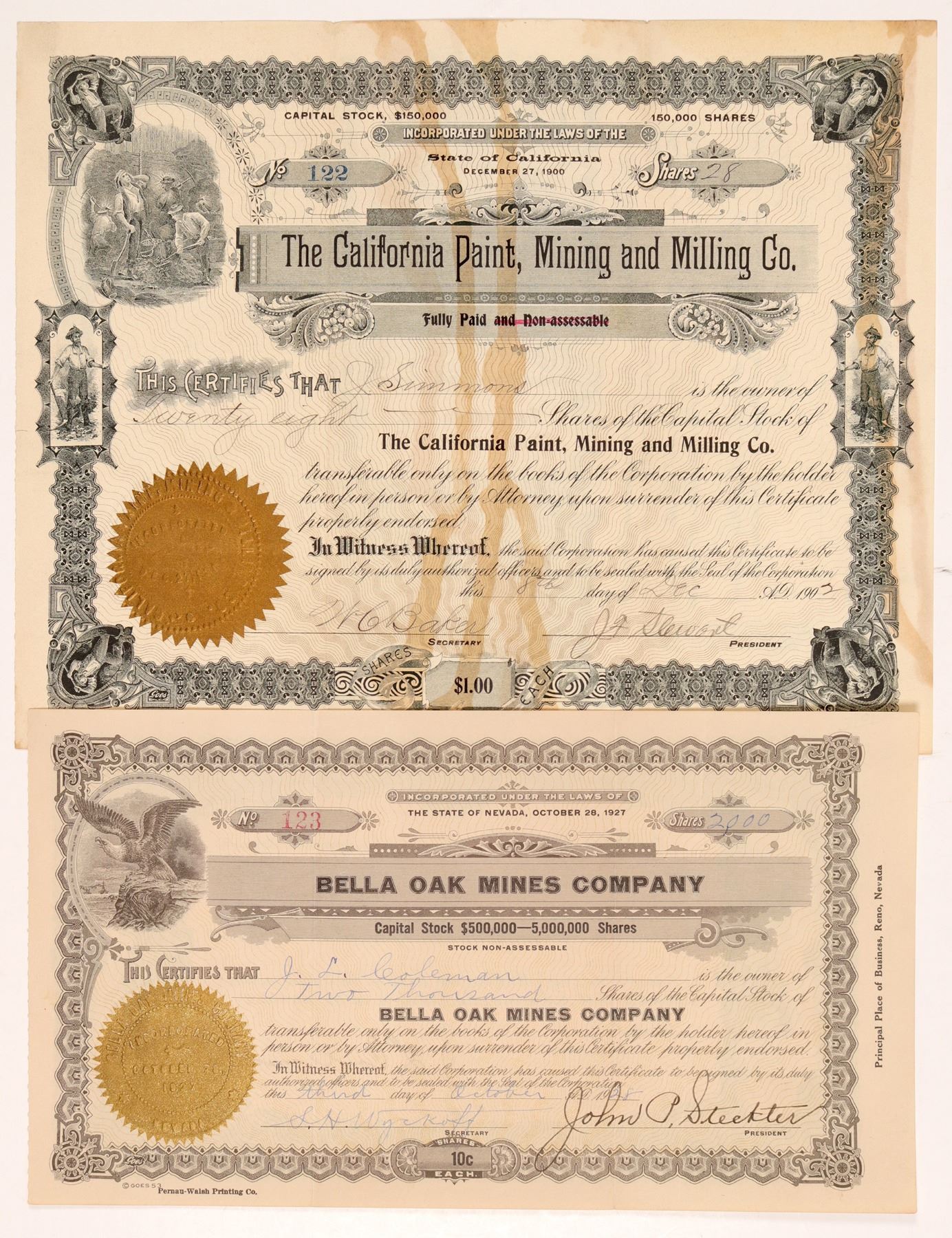 Lot of 2 different. 1) Bella Oak Mines Company. Rutherford. No. 123, issued in 1928, not cancelled. Signed by president John Steckter and sect. SH Wyekoff. Eagle vignette and gold seal. Folds, toning. 2) The California Paint, Mining & Milling Company. Healdsburg. No. 122, issued in 1902. Not cancelled. Signed by president J. Stewart and secretary W. Baker. Multiple mining vignettes. Large stains. Folds, toning. Ken Prag Collection