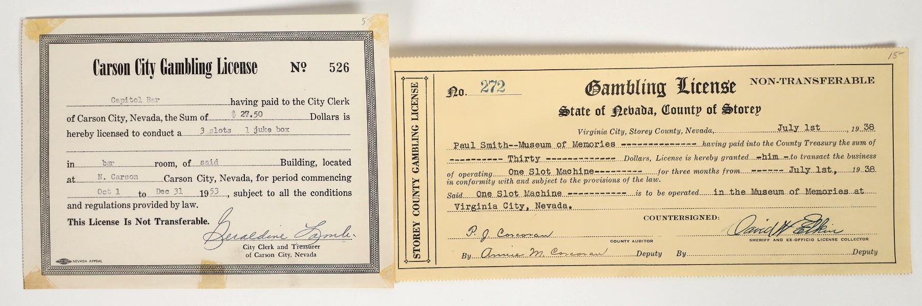 Lot of 2. 1) Rare gambling license for Virginia City, Storey County. Paul Smith of the Museum of the Memories is paying to operate one slot machine for 3 months in 1938. Signed by the sheriff and county auditor. 4 x 10" 2) Carson City Gambling License for the Capitol Bar, 1953. Allowed to have 3 slots and 1 juke box. 5 x 7"