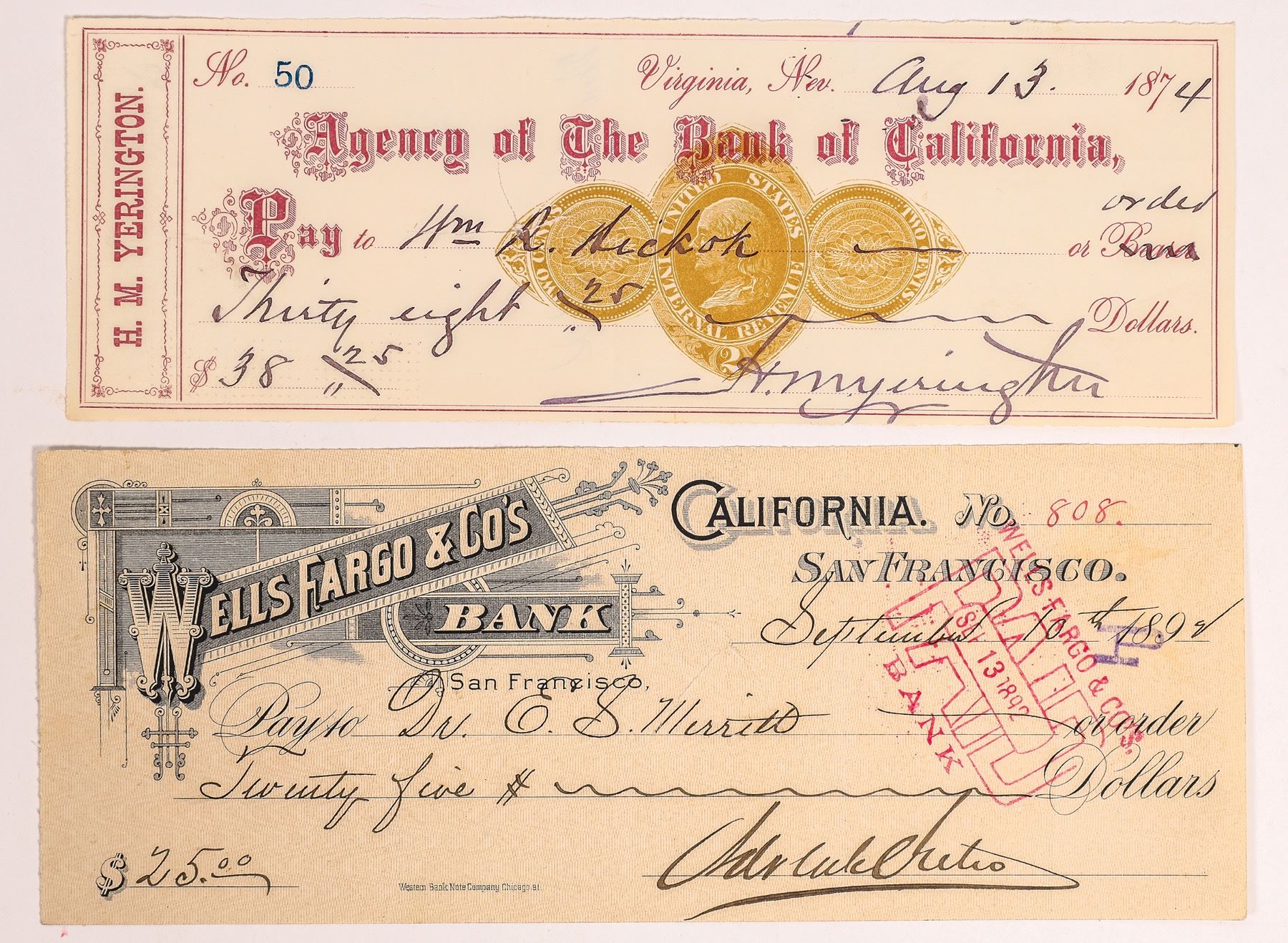 1) Agency of the Bank of California, Virginia, Nev. 1874. Signed by Henry Yerington, builder of the V&T railroad. 2c imprinted revenue stamp. Red on white. 2) Wells, Fargo & Co's Bank. 1892, San Francisco. Signed by Mayor Adolph Sutro who conceived and built the Sutro Tunnel on the Comstock. Addressed to daughter Dr. ES Merritt. She was one of the earliest San Francisco female doctors.