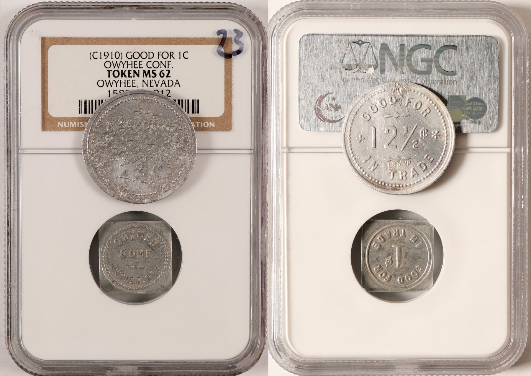 Lot of two: 1) Owyhee Conf., Owyhee, GF 1c, Wm, Sq., 17 mm, NGC certified MS 62. 2) M & L, Elko, GF 12 1/2c In Trade, wm, 25 mm.