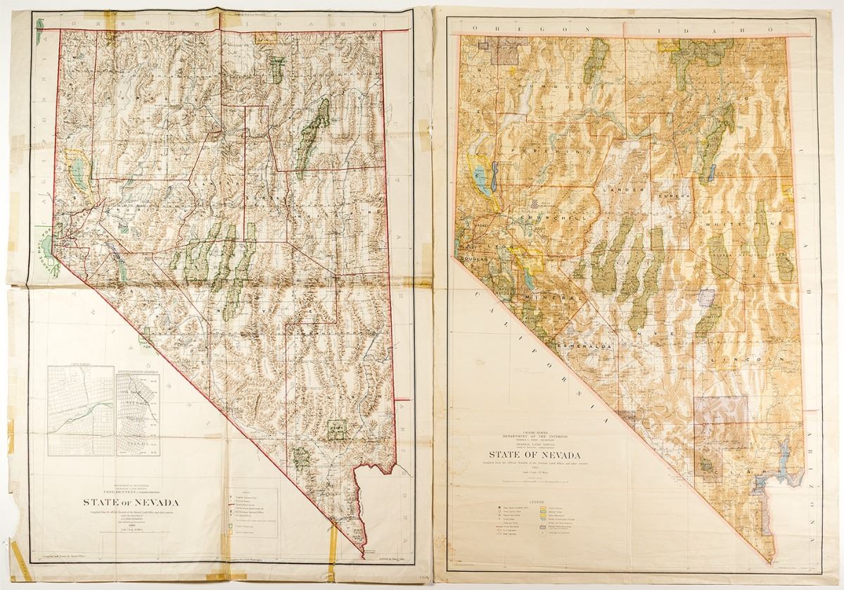 Both are colored. 1908 map has significant taping on the back. See the state before Clark County and after. Watch the growth from mining in Goldfield to Gambling in Las Vegas. State: Nevada City: Date: 1908, 1941 FHWAC#: 27851
