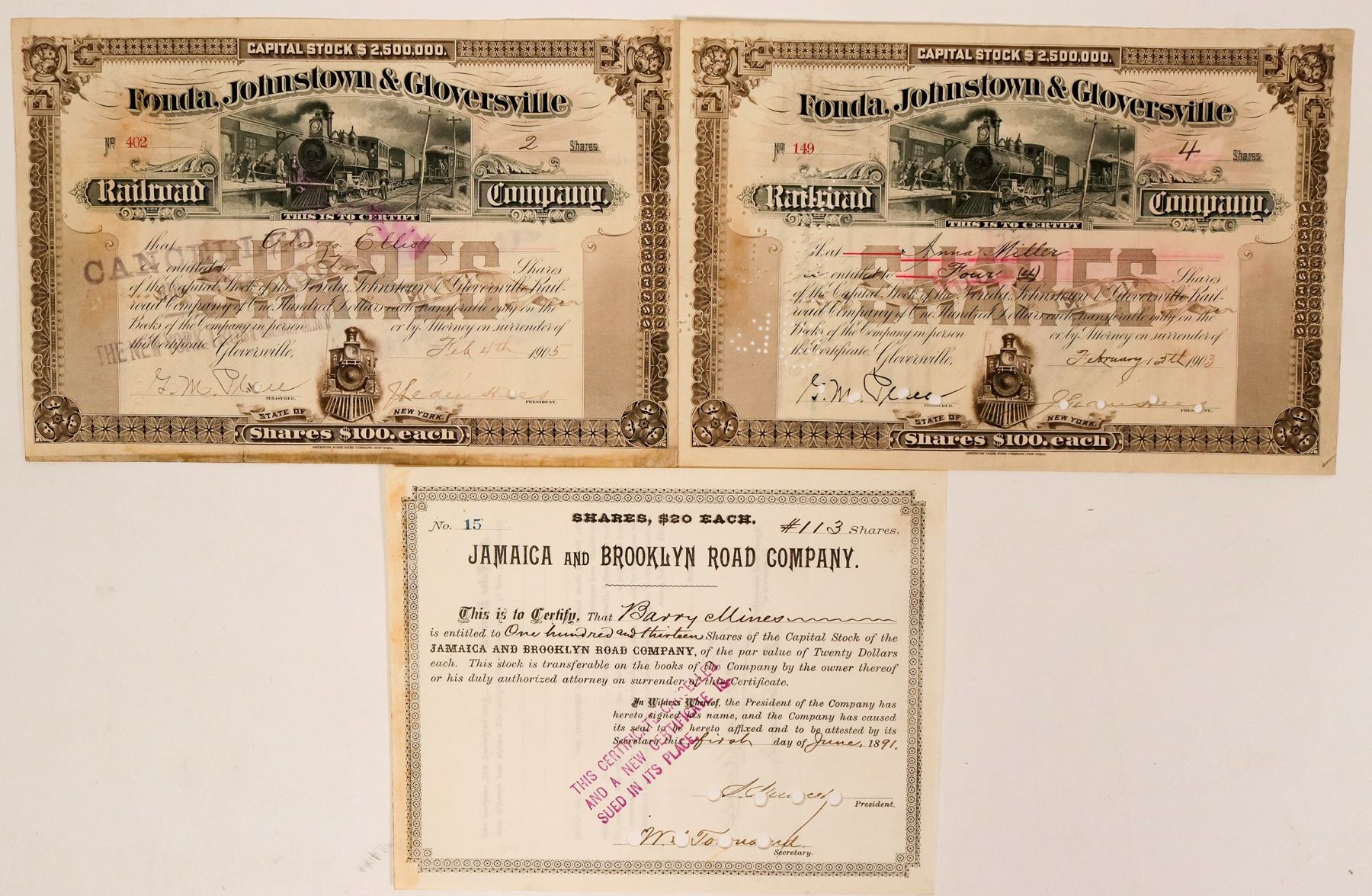 3 certificates. 1. Jamaica and Brooklyn Road Co. incorp. New York. #15, I/C, 113 shares @ $20 ea. Issued June 1891. Black, no vignette , embossed seal. VF 2. Two : Fonda, Johnstown & Gloversville Railroad Co. incorp. New York. Formed in 1867 as a steam railroad. The first train ran from Fonda in 1870 all the way to Gloversville. Gloversville, named after the many glove companies in the area. Both I/C, $100 par issued 1903-05. Brown, embossed seal, vignette top 4-4-0 @ depot , bottom frontal view train. SHARES brown underprint, $100 white outline underprint. American bank Note Co. VF