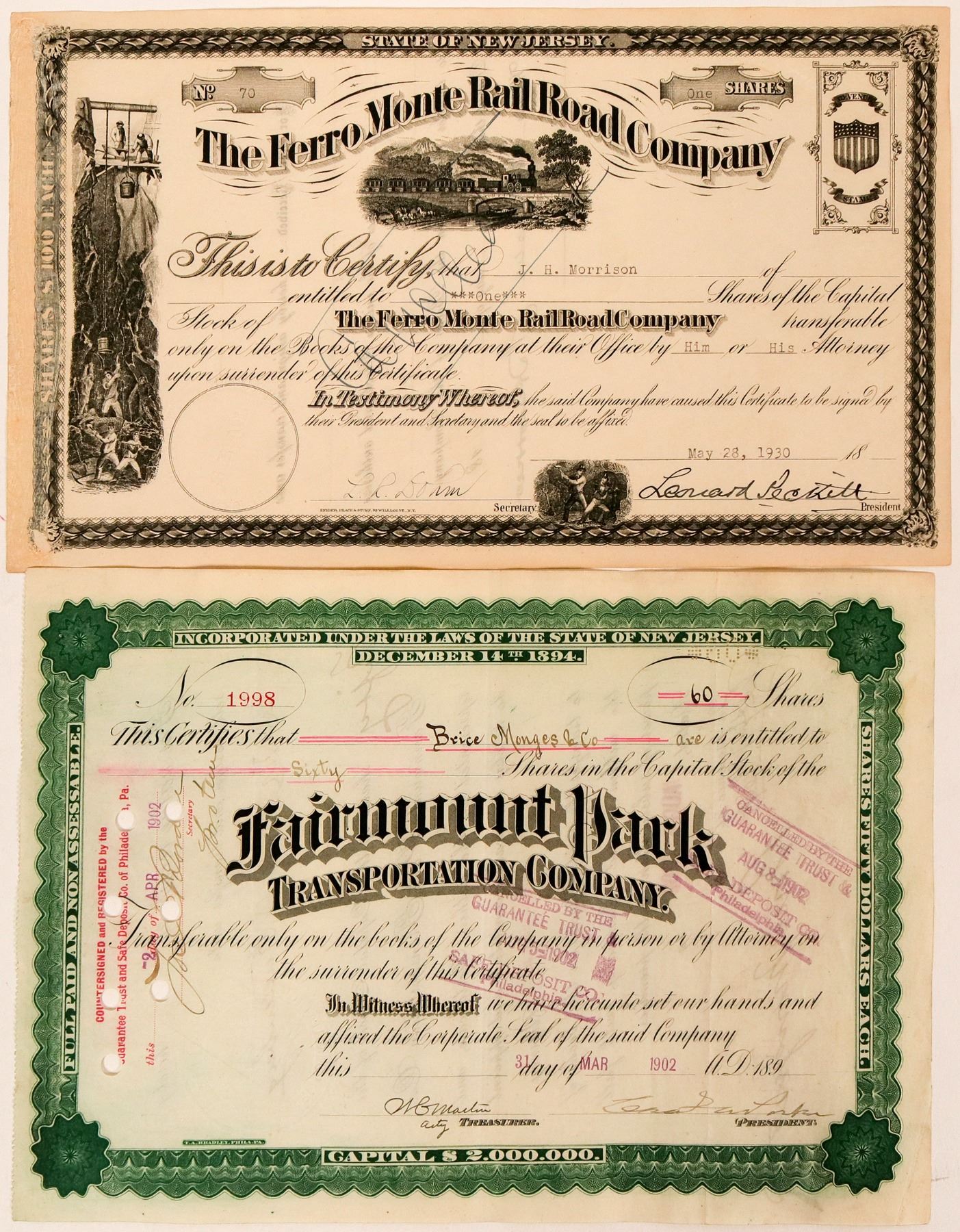 2 certificates. 1. Fairmount Park Transportation Co. incorp. 1894. #1998, I/C, $50 shares issued 1902 (stamped,cert. dateline 189_), Green, embossed seal, no vignette, T.A. Bradley printer. 2. The Ferro Monte Rail Road Co. incorp. 1869 , #70, I/C, $100 shares issued May 28, 1930 (stamped, cert dateline 18__), signed Leonard Pecthell President. Black, embossed seal, vignettes: top coal train, left miners aroking shaft, bottom monersin mine. Snyder , Black & Sturn printer. EF