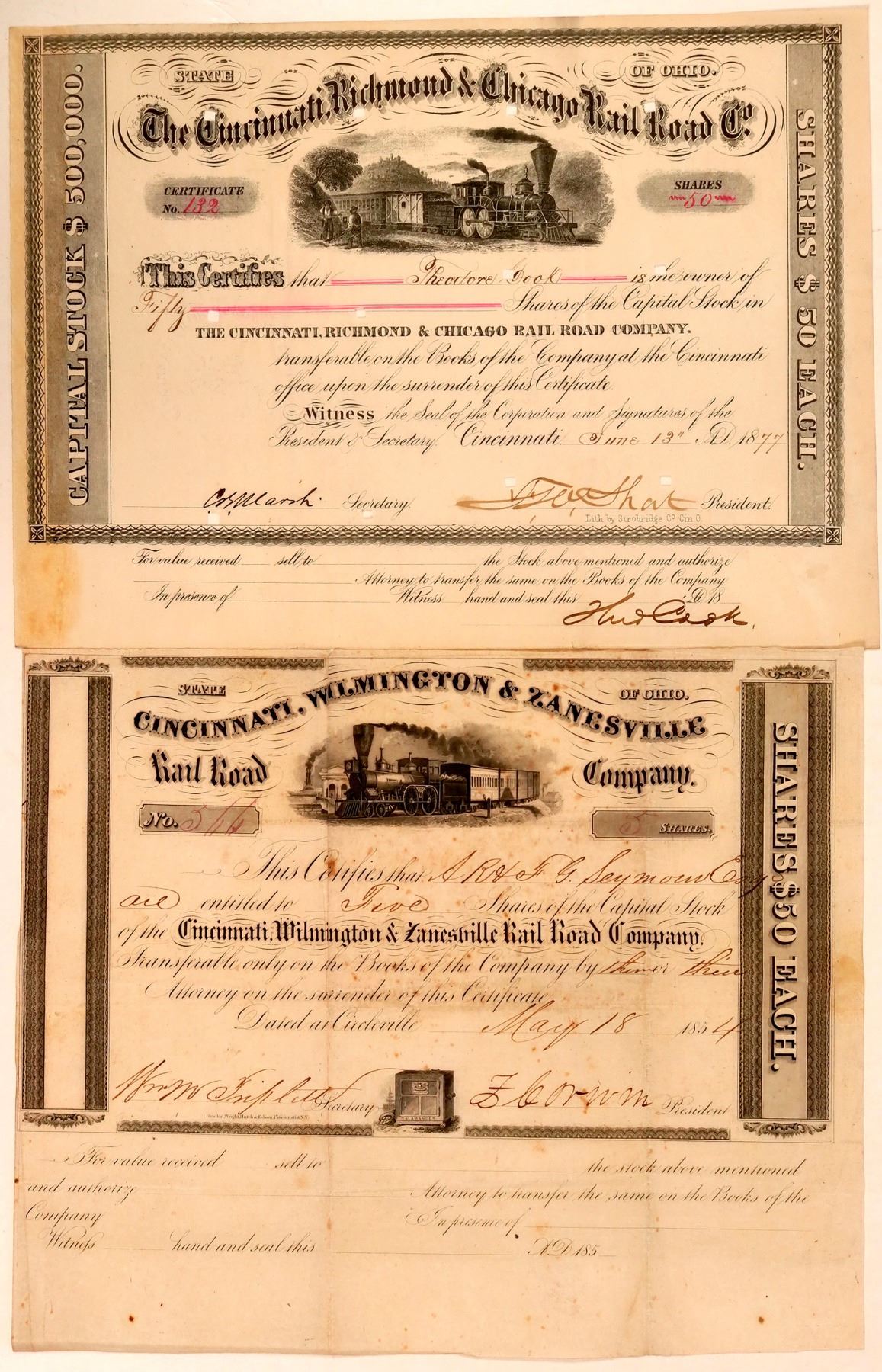 Two different issued Cincinnati railroad stocks. 1) Cincinnati, Wilmington & Zanesville Railroad Co. issued in 1854 for 5 shares. Shares were $50 Each. Train rounds curve r-l. Heavy folds and some slight toning. Uncancelled. 2) Cincinnati, Richmond & Chicago Rail Road Co., issued in 1877 for 50 shares. Shares were $50 each. Two men watch train pass by vignette. Hole punch cancels. Both black print on creme.