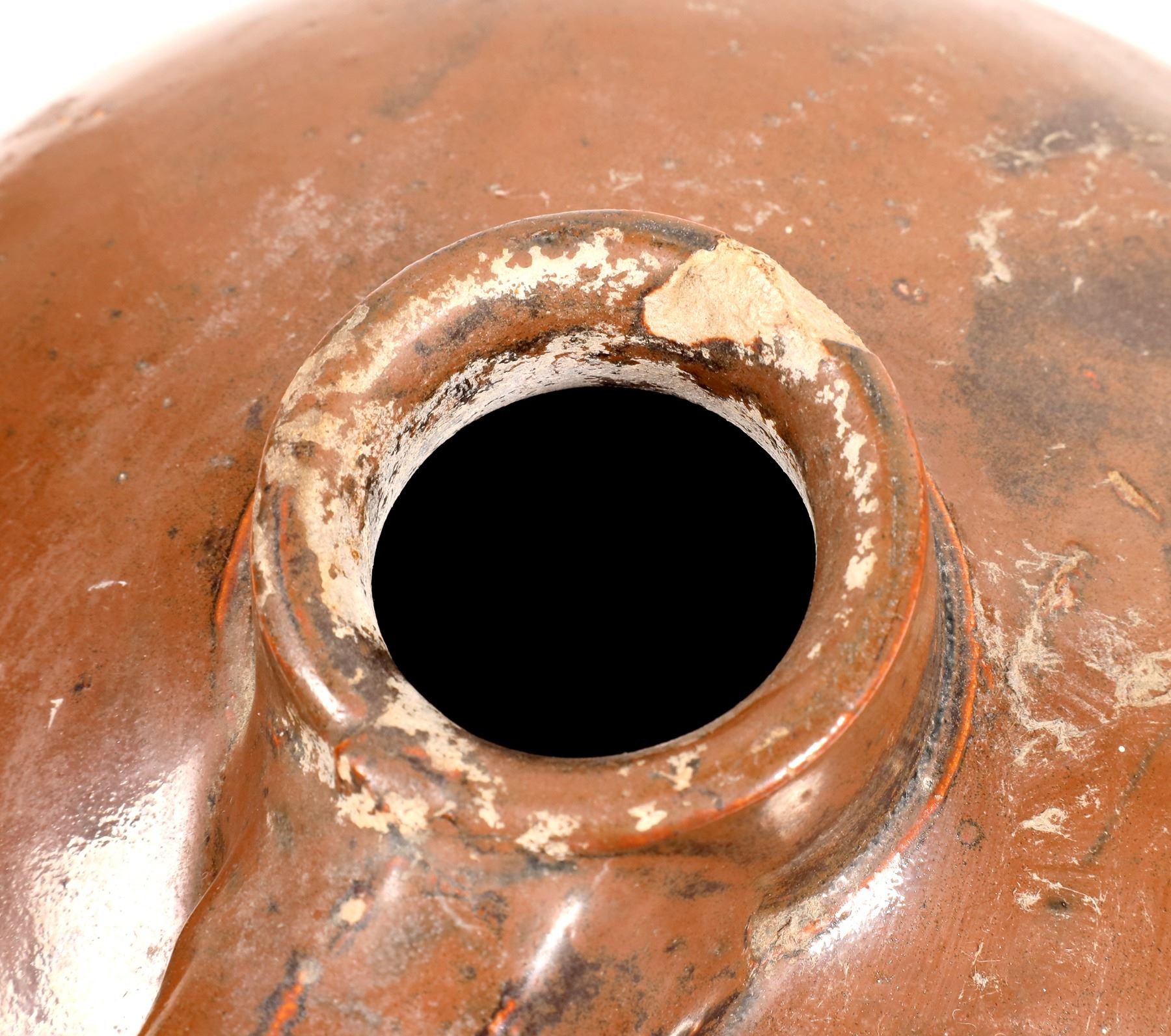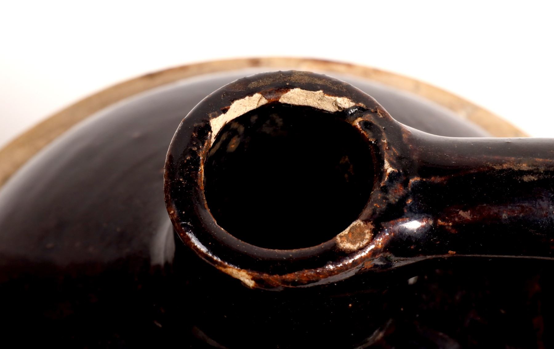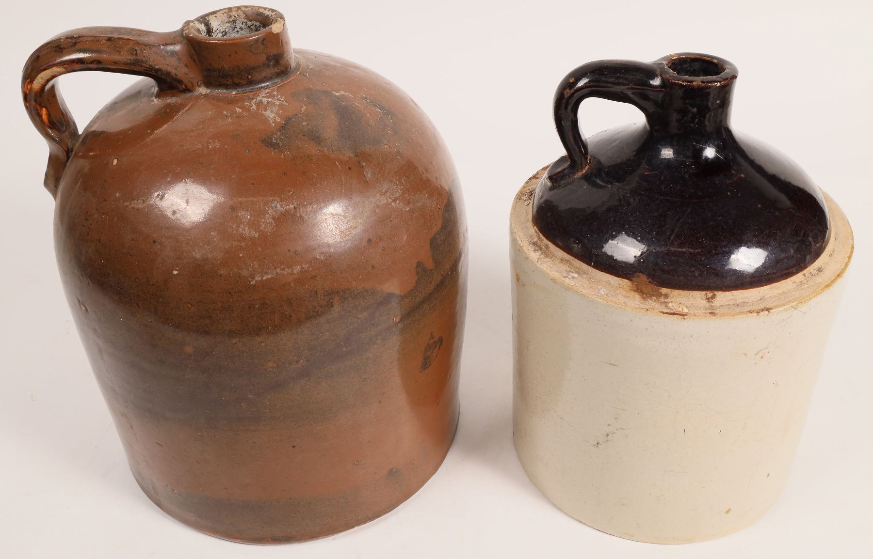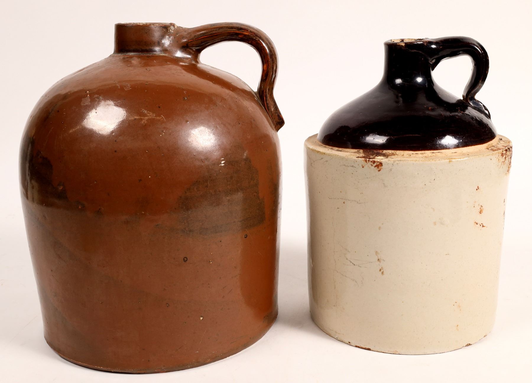 Two whiskey stoneware jugs. One gallon two tone, and a two gallon slope shoulder brown jug. Both have lip chips.