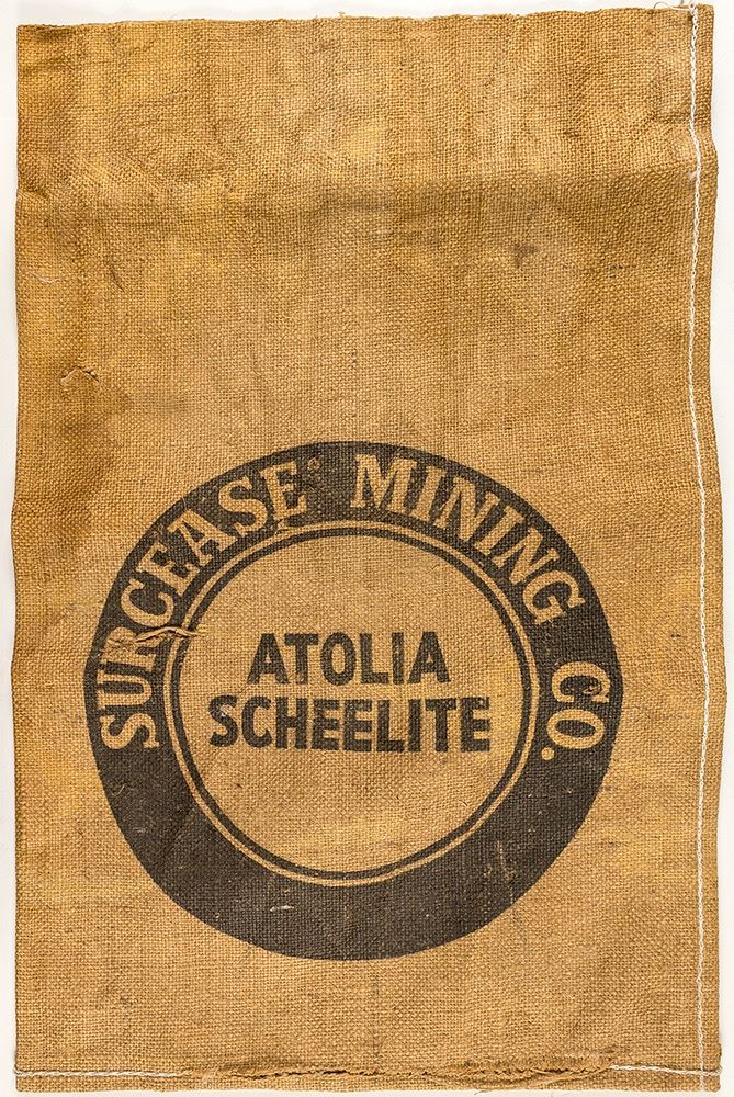 1) Rawhide Mining and Milling Co., Rawhide, Nevada. Sample bag--small. 2) Surcease Mining Co., California. Atolia Scheelite ore shipment bag--large. City: Rawhide State: Nevada Date: hwac# 35476