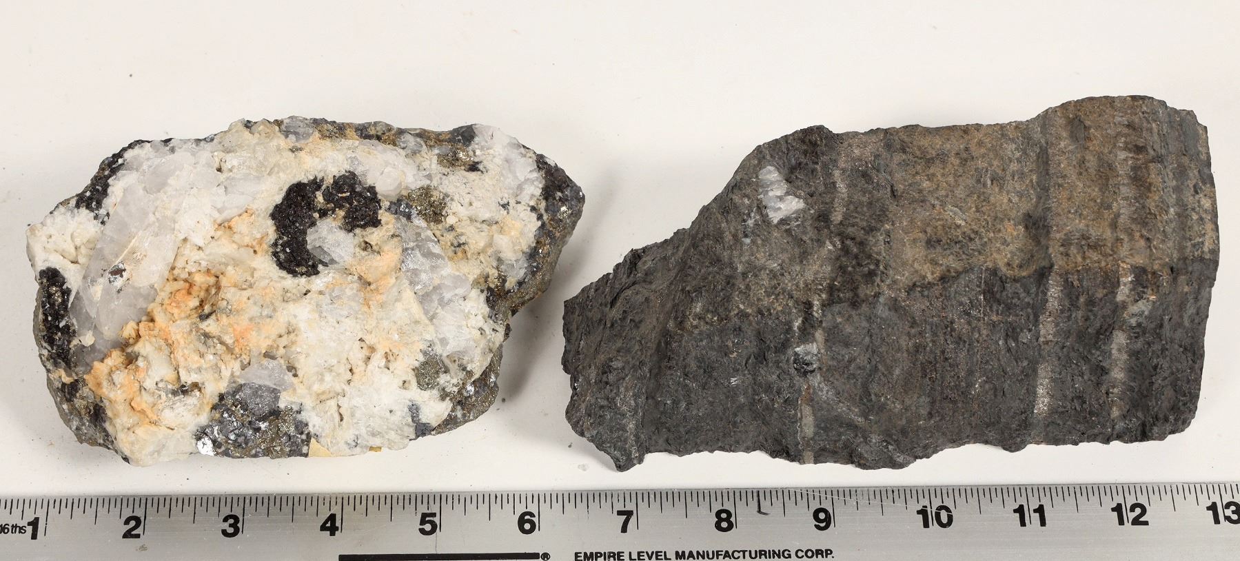 This pair includes a cut specimen of the Homestake Formation, approx. 3 x 7 x 3"; and a specimen of the Tertiary vein system showing mineralization of iron, lead, and zinc (but doesn't carry gold). The Homestake Formation is 2 Ga metamorphosed sedimentary rocks. Please see photos for details.