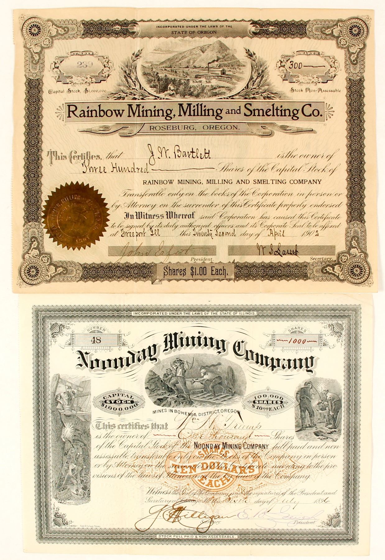 1) Noonday Mining Company. Mines in Bohemia District Oregon (printed under vignette). Inc. in Illinois. No 48, issued for 1,000 shares to Wm. H. Trump on July 6th, 1896. Signed by the president and secretary. Not cancelled. Attractive cert. with three mining vignettes. Pin holes in seal, folds. 2) Rainbow Mining, Milling, and Smelting Co. Roseburg, Oregon. Inc. in Oregon. No. 239, issued for 300 shares to J.W. Bartlett on April 22nd, 1902. Signed by the president (Lamb) and secretary (Erfert). Not cancelled. Vignette of mine/mill below mountain.Folds. State: Oregon Al Adams Collection. HWAC# 59058