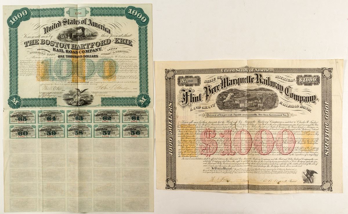 1) Flint and Pere Marquette Railway Company $1,000 bond. Punch cancelled. Three revenue imprints: W2 (left), P5 (front right), and P5 (reverse). 2) Boston, Hartford & Erie Rail Road Company $1,000 bond. Very clean. Sixty coupons remaining. Three revenue imprints: W2 (center) with P5s on either side. Not cancelled. (Prag Collection) City: State: Date: ID# 34028
