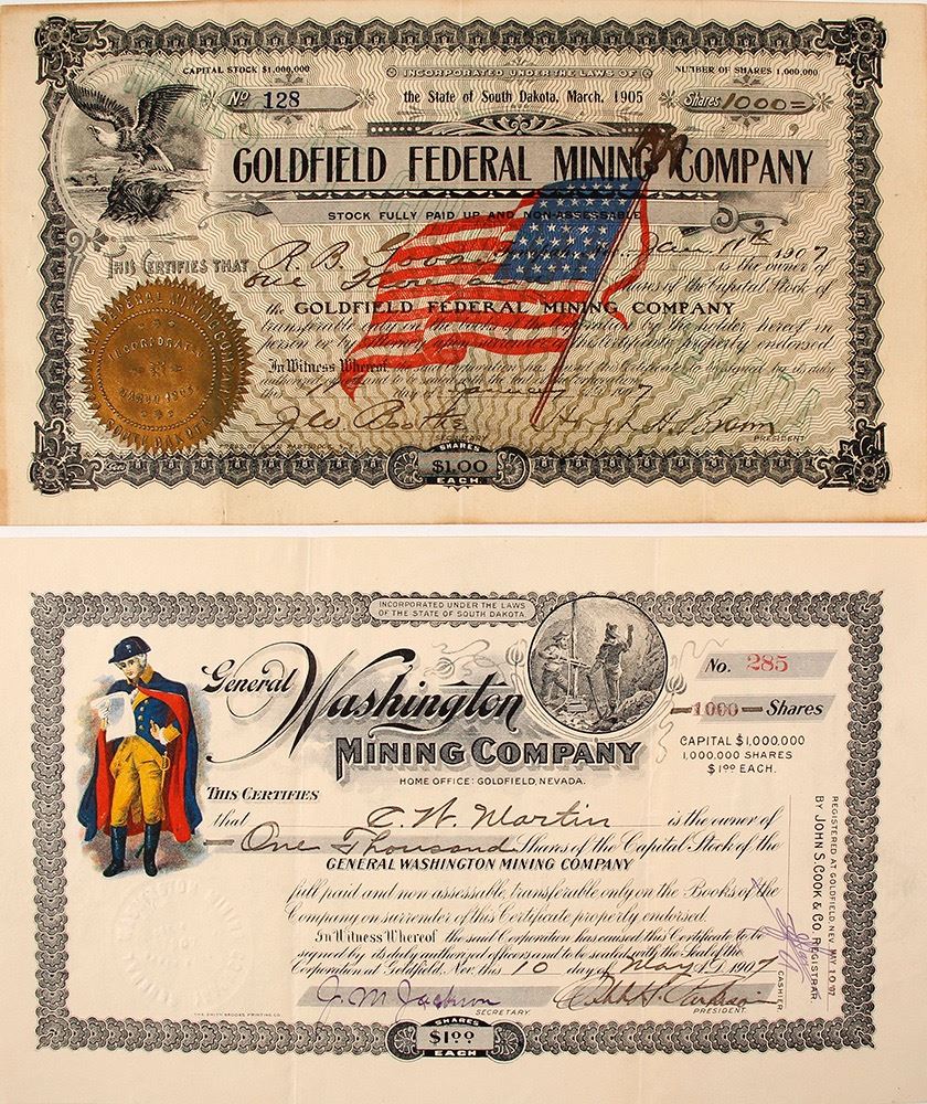 2) Goldfield Federal Mining Company. Large American flag fills the center of the stock and a bald eagle vignette is in the upper left. Number 128 for 1000 shares to RB Govan in 1907. Signed by JW Boothe and Hugh H Brown. Again - an attention getting stock certificate. There was a Hugh Brown who was the secretary / treasurer of the Goldfield Mohawk in 1904 and in the same year was the state agent for the Combination Mines. Hugh H Brown was most famous as a lawyer at Tonopah. Comparing signatures, these all seem to be the same person. (Bennett Collection) Date: 1907 Location: Goldfield, Nevada HWAC# 59858