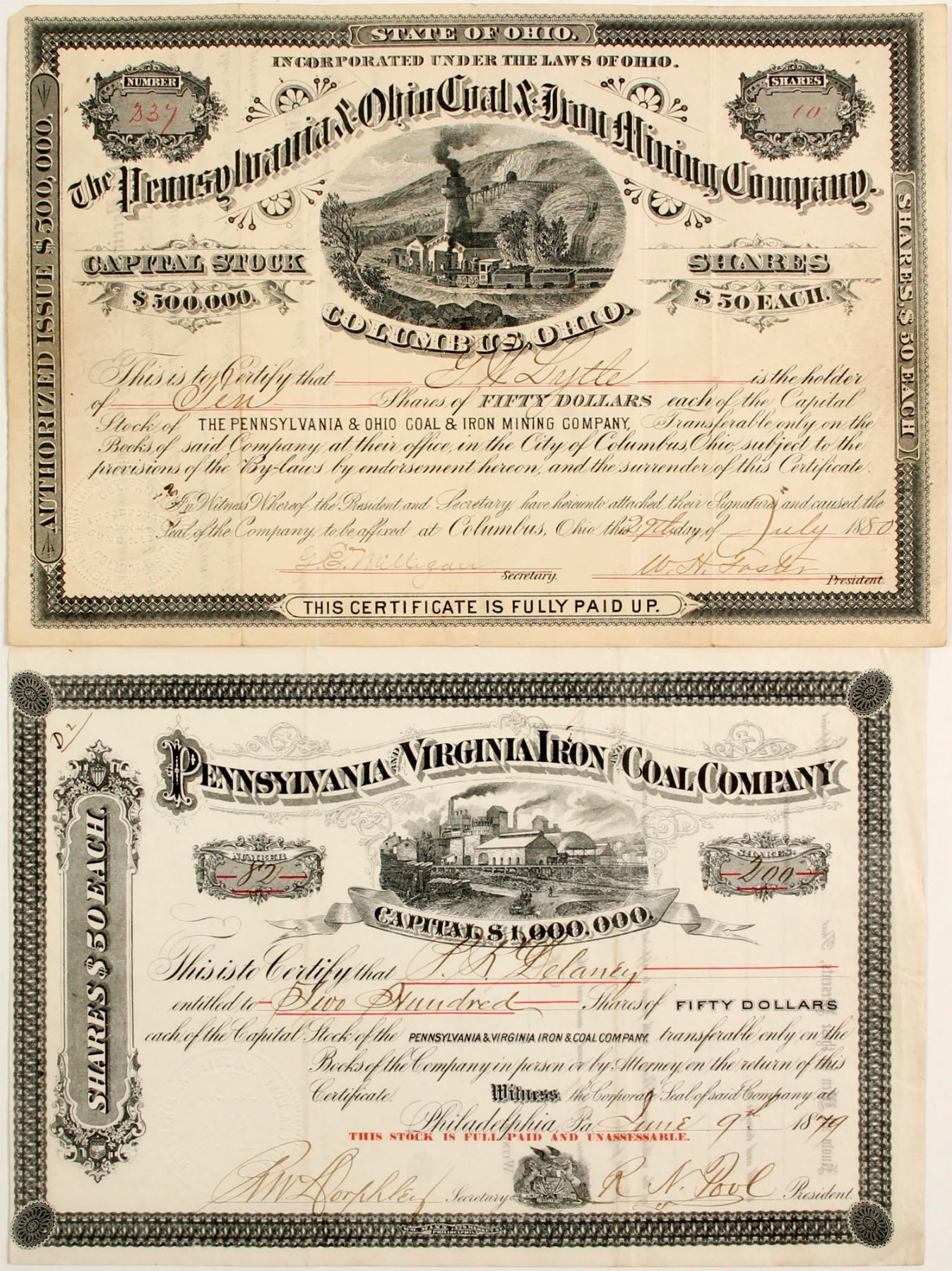 1) Pennsylvania and Virginia Iron and Coal # 82 for 200 shares to Delaney. Signed by Dorphley and president RN Pool. Milling vignette. Dateline 1879. 2) Pennsylvania & Ohio Coal and Iron Mining # 237 for 10 shares to Lytle. Signed by Milligan and president WH Foster. Dateline Columbus 1880. Incorporated 1880. Mines at Columbus, Ohio. Very nice coal train mine, mill with large round stack. Prag Collection State: Pennsylvania City: Date: 1879 HWAC# 83950