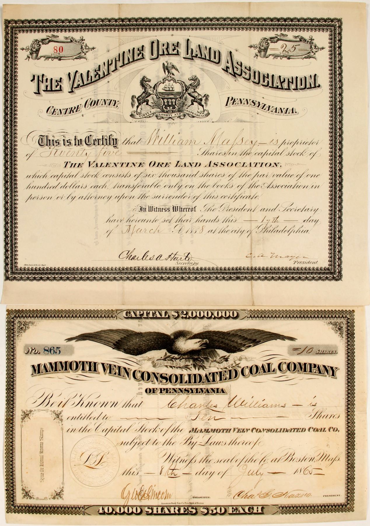 1) Mammoth Vein Consolidated Coal Company of Pennsylvania. # 865 for 10 shares to Charles Williams. Signed by secretary George (?) and president Charles Narsio(?). datline Boston 1865. Not canclled. eagle vignette. Top has been folded over. Nice condition. 2) Valentine Ore Land Association. Centre County. # 80 for 25 shares to William Massey. Signed by Charles Hart and CA Mayer president. Seal vignette. Dateline Philadelphia 1888. No serious issues with this cert. Prag Collection State: Pennsylvania City: Date: 1865, 1888 HWAC# 83975
