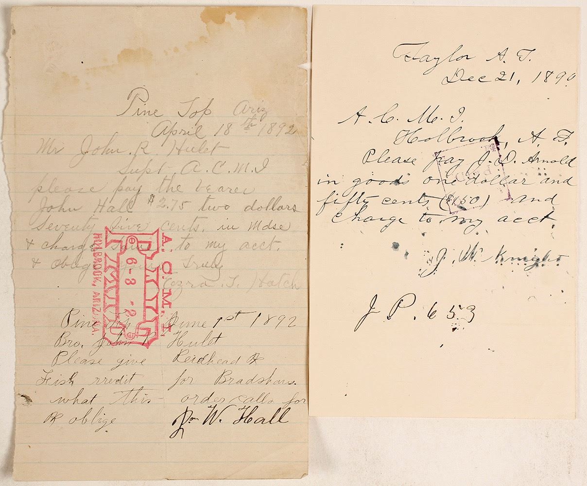 Rare pair of manuscript scrip from the ACMI in Taylor and Pine Top, Arizona. 1) Dateline Taylor, AT, Dec. 21, 1890. Addressed to A.C.M.I., the Arizona Co-operative Mercantile Institution, in Holbrook. "Please pay J.D. Arnold in goods one dollar and fifty cents." Signed by J.W. Knight. 7 x 4.5" Ink stains. 2) Dateline Pine Top Ariz., April 18th, 1892. Addressed to John R. Hulst, sup. A.C.M.I. "Please pay the bearer John Hall $2.75 in mdse." Stamped Paid ACMI, Holbrook. 8 x 5" Staining on top, rough edge. Founded in 1881, the ACMI was the Arizona version of the ZCMI (Zion's Cooperative Mercantile Institution) in Salt Lake City. The ACMI was originally begun as a wholesaler for Mormon towns in the region, purchasing supplies at prices that individual settlements could not command. However, it quickly assumed an important credit function. (Potter Collection) HWAC# 60162 Date: 1890 & 1892 Location: Arizona