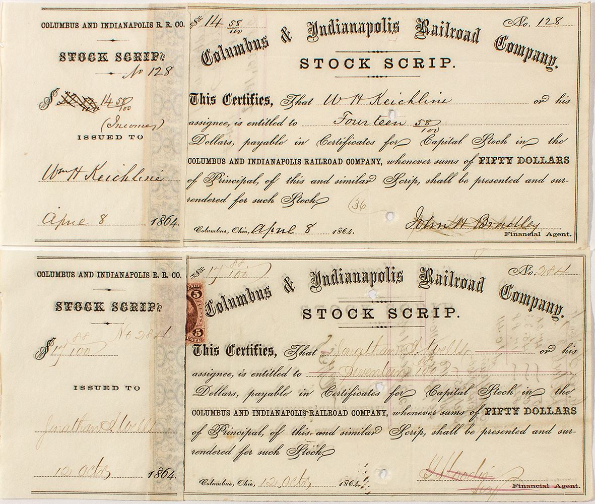 Both pieces issued in 1864: one for $17.88 in certificates, the other for $14 in certificates. One has a 5 cent brown adhesive revenue stamp. Signed by different financial agents; both signatures pen cancelled. Measure 4.25" x 10." Punch holes and folds.