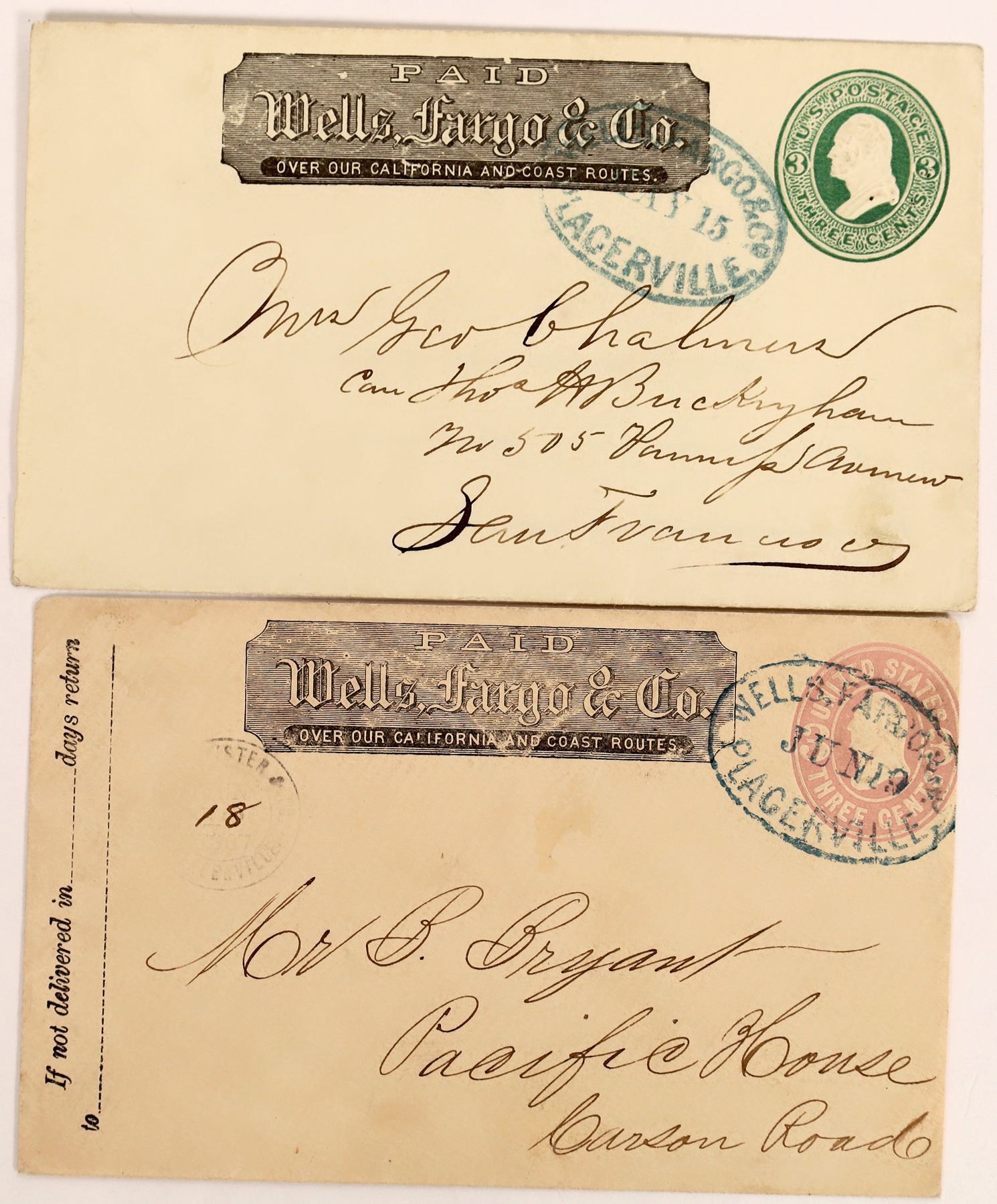 1) Addressed to Mr. B. Bryant, Pacific House, Carson Road. Pacific was an original toll house and stage stop built by Wheeler Bartram in the early years of the gold rush. It was called Pacific House Ranch after Bartram’s Pacific Sawmill. Bartram had extensive lumbering interests over much of the county. He also built a toll road through the area. Brockliss Bridge crossed the river just east and down the hill from Pacific. 2) Addressed to Mrs. George Chalmers, San Francisco. Most probably the George Chalmers of the Chalmers Catawba Wine Bitters - one of the rarest wine bottles form California.