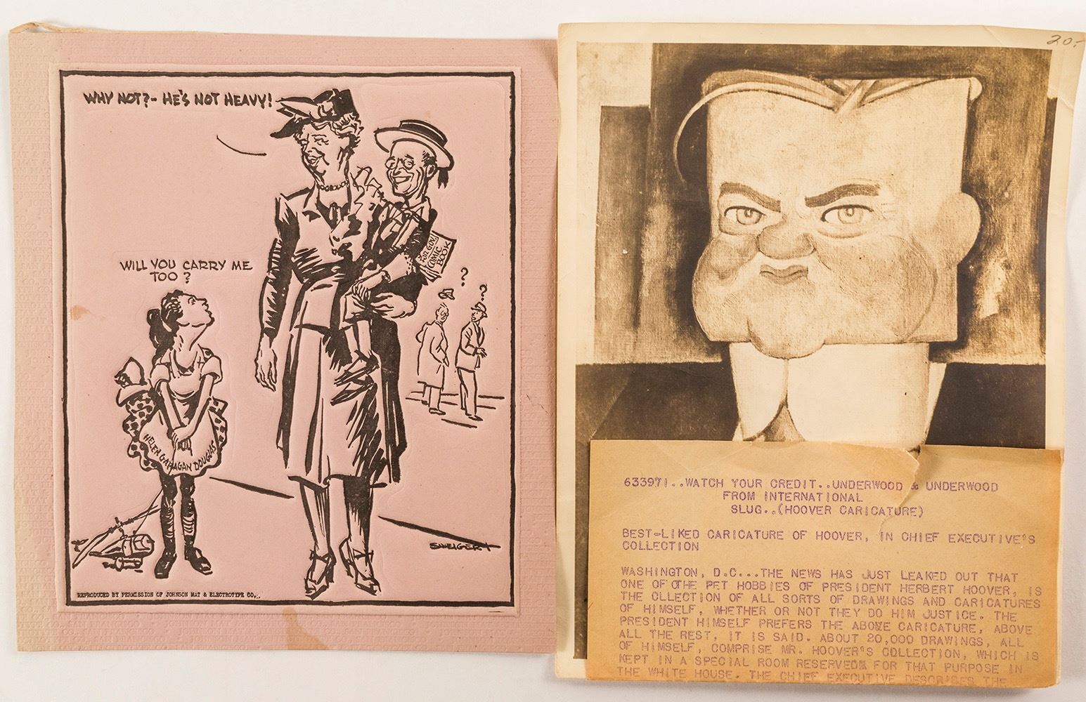 1) Best liked caricature of Hoover, in Chief Executive's Office. 2) Eleanor Roosevelt carrying her husband during the Governor's race in New York. Young girl (Helen Gahagan Douglas) asks if she can carry her too. Douglas was running in California. She was the first female Democrat elected to Congress in California. Date: Location: HWAC # 55014