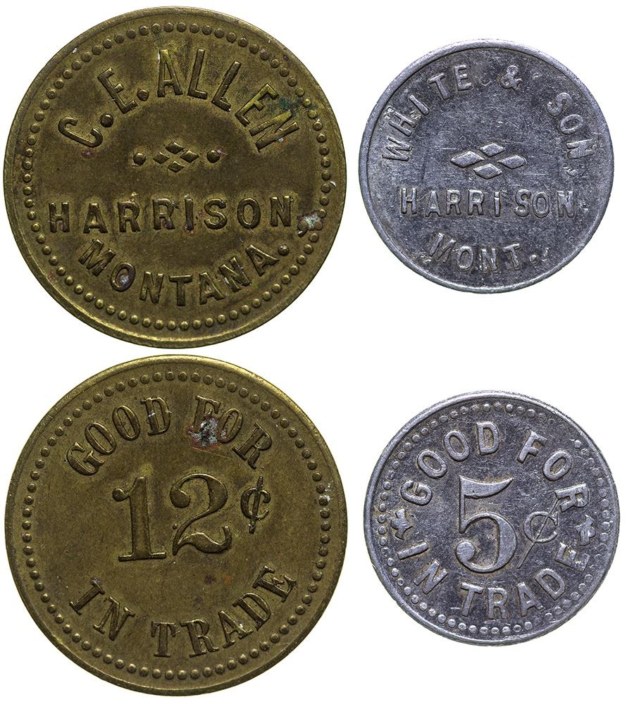 R-8 tokens. 1) C. E. Allen / Harrison / Montana // GF / 12 1/2 c / IT. Brass, round, 24mm. 2) White & Son / Harrison / Mont. // GF / 5c / IT. Aluminum, round, 18mm. City: Harrison State: Montana, Date: Inventory# 39628